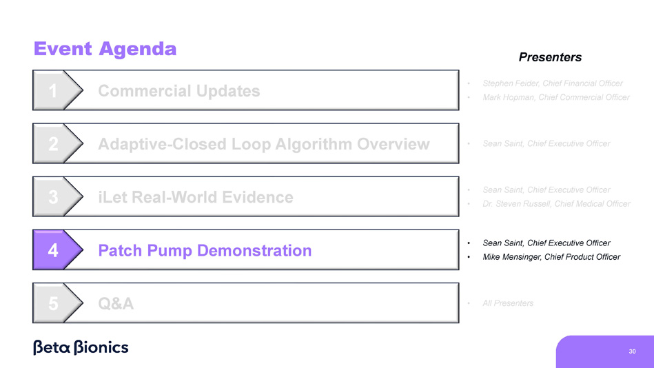 These data do not come from a prospective study designed to evaluate the effect of the iLet Bionic Pancreas in subgroups by frequency of meal announcements. Real - world data comes from the 21 - day period ending 5/18/2025 of iLet usage among those people with baseline HbA1c data and who uploaded data to Beta Bionics, Inc., including users who do not meet all criteria in the Indications for use. Individual user results may vary from the average values shown here. 29 Note: 1. Glucose Management Indicator (GMI). American Diabetes Association (ADA). Fully - closed loop iLet users defined as users who announced <1 meal per day on average over the 21 - day period ending May 18, 2025 • On average, “fully - closed loop” iLet users announced ~1 meal every 3 days • “Fully - closed loop” users achieved ~62% time in range, on average • ~83% of “fully - closed loop” iLet users meeting ADA hypoglycemia goals • 530 iLet users have not announced a single meal over the past 21 days □ Improvement from baseline A1c of 9.4% to a follow - up GMI of 7.4% □ ~86% meeting ADA hypoglycemia goals >9% (N=1,227) 11.1% 7 - 9% (N=980) 8.1% Overall (N=2,416) 9.4% <7% (N=209) 6.4% 7.7% 7.5% 7.3% 7.0% - 3.4% - 1.9% - 0.8% +0.6% Baseline HbA1c Average Baseline HbA1c Average Change Average GMI on the iLet Event Agenda 1 2 5 4 3 30 Commercial Updates Q&A Adaptive - Closed Loop Algorithm Overview iLet Real - World Evidence Patch Pump Demonstration Presenters • Stephen Feider, Chief Financial Officer • Mark Hopman, Chief Commercial Officer • All Presenters • Sean Saint, Chief Executive Officer • Sean Saint, Chief Executive Officer • Dr. Steven Russell, Chief Medical Officer • Sean Saint, Chief Executive Officer • Mike Mensinger, Chief Product Officer