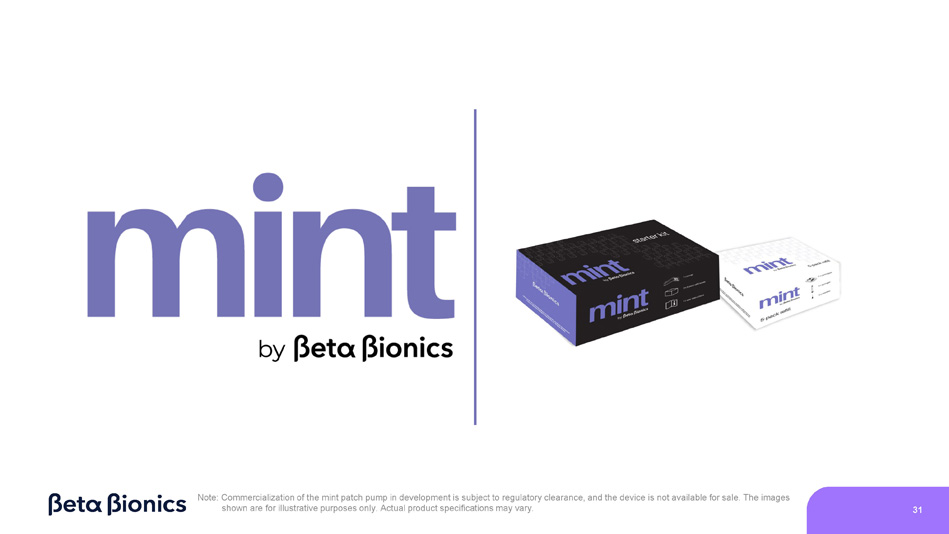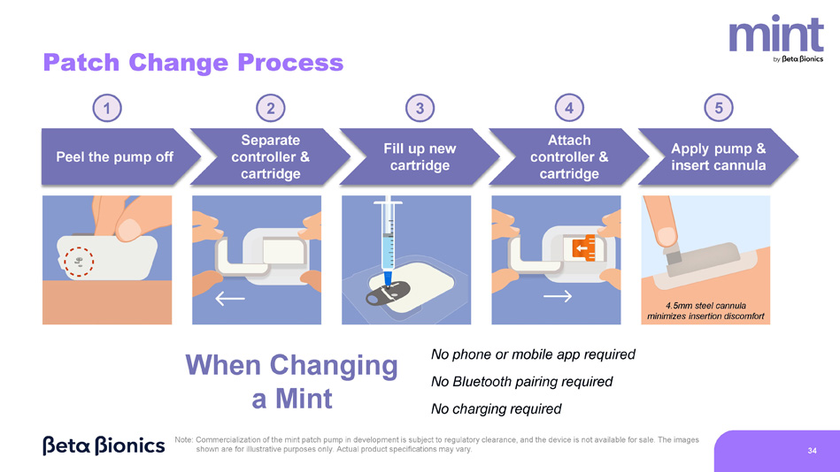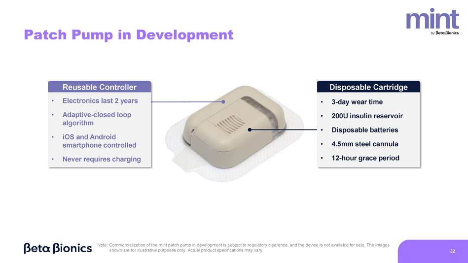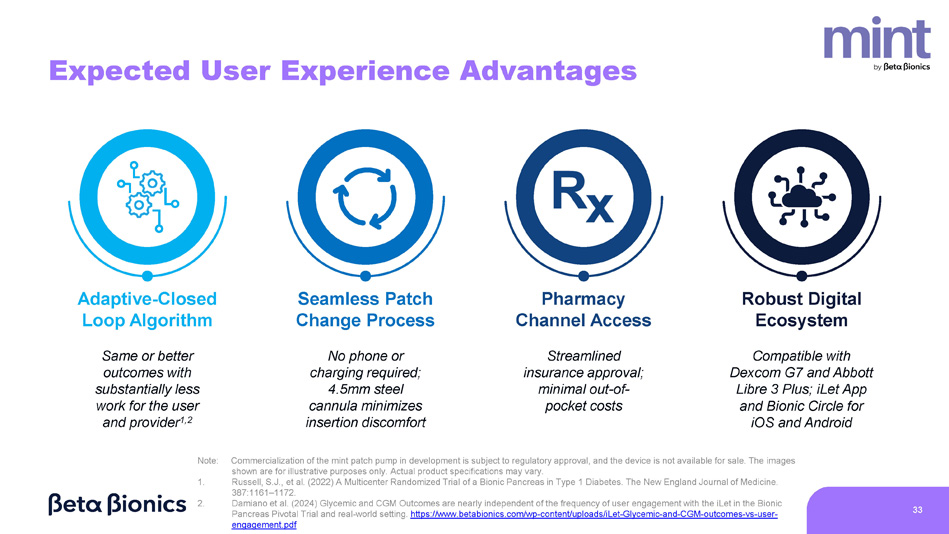 Note: Commercialization of the mint patch pump in development is subject to regulatory clearance, and the device is not available for sale. The images shown are for illustrative purposes only. Actual product specifications may vary. 31 Patch Pump in Development Reusable Controller • Electronics last 2 years • Adaptive - closed loop algorithm • iOS and Android smartphone controlled • Never requires charging Disposable Cartridge • 3 - day wear time • 200U insulin reservoir • Disposable batteries • 4.5mm steel cannula • 12 - hour grace period Note: Commercialization of the mint patch pump in development is subject to regulatory clearance, and the device is not available for sale. The images shown are for illustrative purposes only. Actual product specifications may vary. 32 33 Adaptive - Closed Loop Algorithm Seamless Patch Change Process Pharmacy Channel Access Robust Digital Ecosystem Same or better outcomes with substantially less work for the user and provider 1,2 No phone or charging required; 4.5mm steel cannula minimizes insertion discomfort Streamlined insurance approval; minimal out - of - pocket costs Compatible with Dexcom G7 and Abbott Libre 3 Plus; iLet App and Bionic Circle for iOS and Android Expected User Experience Advantages Note: Commercialization of the mint patch pump in development is subject to regulatory approval, and the device is not available for sale.