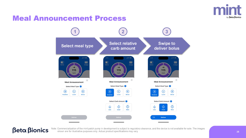 Patch Change Process Separate controller & cartridge 1 2 Fill up new cartridge 3 Attach controller & cartridge 4 Peel the pump off Apply pump & insert cannula 5 Note: Commercialization of the mint patch pump in development is subject to regulatory clearance, and the device is not available for sale. The images shown are for illustrative purposes only. Actual product specifications may vary. 34 4.5mm steel cannula minimizes insertion discomfort No phone or mobile app required No Bluetooth pairing required No charging required When Changing a Mint Meal Announcement Process Select relative carb amount 1 2 Swipe to deliver bolus 3 Select meal type Note: Commercialization of the mint patch pump in development is subject to regulatory clearance, and the device is not available for sale.