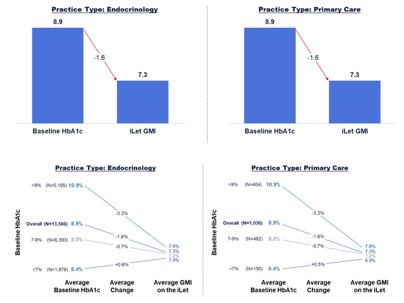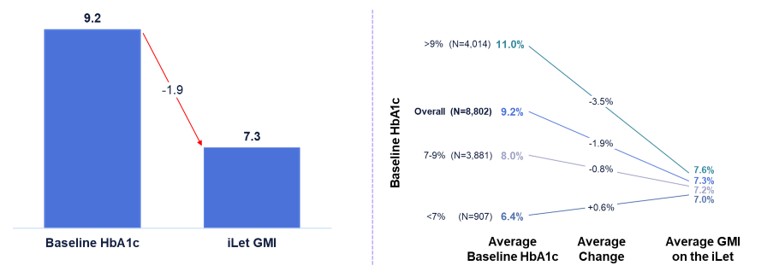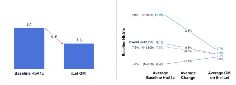 Figure 4 shows the change from baseline HbA1c to GMI on the iLet for iLet users whose previous therapy before starting iLet was multiple daily injections (“MDI”) (as provided to us by the medical providers). Of the aforementioned 14,952 iLet users, 8,802 iLet users were identified as using MDI as their most recent therapy prior to starting iLet. Data from these previous MDI users showed an overall improvement from an average baseline HbA1c of 9.2% to an average GMI of 7.3% on the iLet. Users saw a meaningful change from baseline HbA1c to follow-up GMI on iLet regardless of their baseline HbA1c. Additionally, over 85% of users met the ADA’s aforementioned hypoglycemia goals.