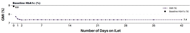 Figure 8 shows the change from baseline HbA1c to follow-up GMI on the iLet relative to the duration of iLet use from initialization to day 42. These data are sourced from all iLet users who uploaded CGM readings to the Beta Bionics cloud over the first two years after the iLet’s commercial launch (May 19, 2023 to May 18, 2025). 90% of these users had a baseline HbA1c available, but all users were included in the analysis regardless of whether or not they had a baseline HbA1c available. In total, 30,077 iLet sessions were uploaded. A session reflects each initial use of an iLet or after a factory reset. Most iLets had only one session. iLet sessions showed an overall improvement from an average baseline HbA1c of 8.9% to an average GMI of 7.4% on the iLet after 42 days. On average, the iLet sessions took two days to reach a near steady-state GMI of 7.4%, suggesting that the adaptive algorithm “warms-up” just two days after initiation.
