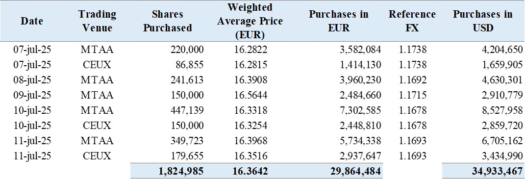 From July 7, 2025 to (and including) July 11, 2025, the Company has purchased a total of 1,824,985 ordinary shares for a total consideration of €29,864,484, equivalent to USD34,933,467.
