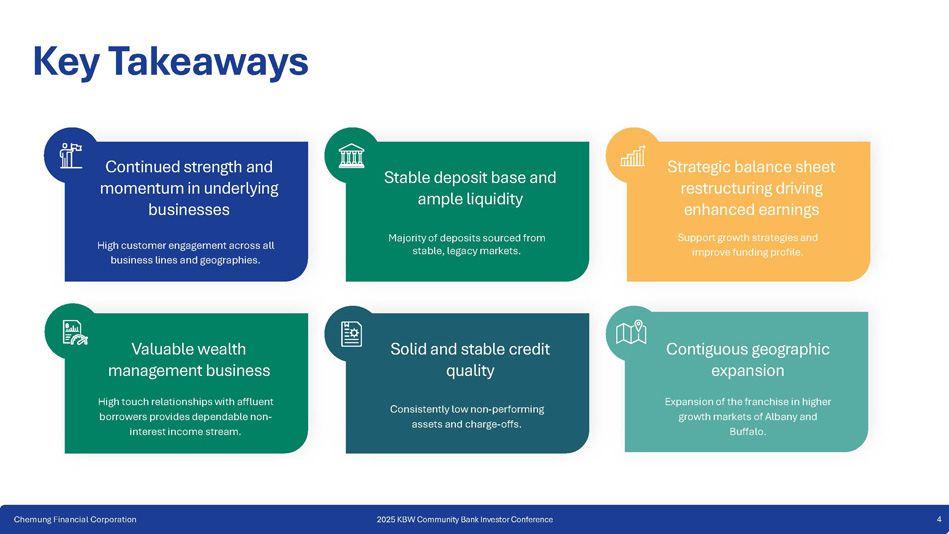 Chemung Financial Corporation Safe Harbor Statement Forward - looking Statements: This report contains forward - looking statements within the meaning of Section 27A of the Securities Act. The Corporation intends its forward - looking statements to be covered by the safe harbor provisions for forward - looking statements in these sections. All statements regarding the Corporation’s expected financial position and operating results, the Corporation’s business strategy, the Corporation’s financial plans, forecasted demographic and economic trends relating to the Corporation’s industry and similar matters are forward - looking statements. These statements can sometimes be identified by the Corporation’s use of forward - looking words such as “may,” “will,” “anticipate,” “estimate,” “expect,” or “intend.” The Corporation's actual results could be materially different from expectations because of various factors, including changes in economic conditions or interest rates, credit risk, inflation, tariffs, cybersecurity risks, difficulties in managing the Corporation’s growth, recent bank failures, changes in FDIC assessments, public health issues, geopolitical conflicts, competition, changes in law or the regulatory environment, and changes in general business and economic trends. Information concerning these and other factors, including Risk Factors, can be found in the Corporation’s periodic filings with the SEC, including the discussion under the heading “Item 1A. Risk Factors” in the Corporation’s 2024 Annual Report on Form 10 - K. These filings are available publicly on the SEC’s web site at http://www.sec.gov , on the Corporation's web site at http://www.chemungcanal.com or upon request from the Corporate Secretary at (607) 737 - 3746. Except as otherwise required by law, the Corporation undertakes no obligation to publicly update or revise its forward - looking statements, whether as a result of new information, future events, or otherwise. 3 Chemung Financial Corporation Key Takeaways 4 2025 KBW Community Bank Investor Conference Continued strength and momentum in underlying businesses High customer engagement across all business lines and geographies.