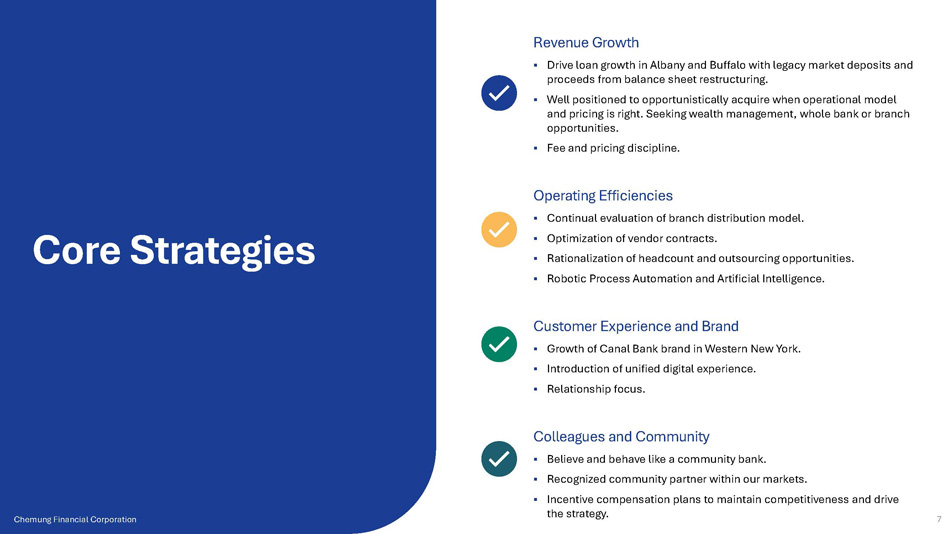 Chemung Financial Corporation Oldest locally owned and managed community bank in New York State, dating to 1833. Subsidiary bank - Chemung Canal Trust Company - operates with 30 branches over 14 counties in New York and Pennsylvania. Operating as Capital Bank in Albany, New York market and Canal Bank in Buffalo, New York market. Trust and Wealth Management division with $2.3 bn in assets under management or administration. New York chartered bank and member of the Federal Reserve Listed on NASDAQ Global Select (Ticker: CHMG) Market Capitalization of $233.1 million at June 30, 2025 About Us 6 History Operations Legal & Market 6 2025 KBW Community Bank Investor Conference Chemung Financial Corporation Revenue Growth ▪ Drive loan growth in Albany and Buffalo with legacy market deposits and proceeds from balance sheet restructuring.