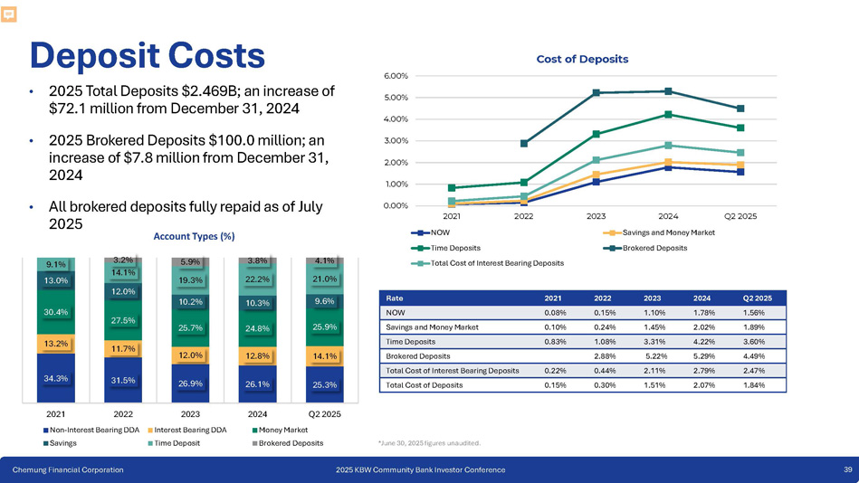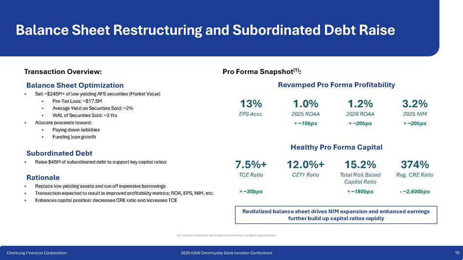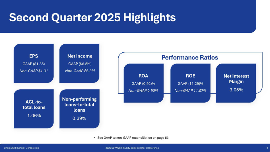 Core Strategies 7 Chemung Financial Corporation Second Quarter 2025 Highlights 8 EPS GAAP ($1.35) Non - GAAP $1.31 Net Income GAAP ($6.5M) Non - GAAP $6.3M ROA GAAP (0.92)% Non - GAAP 0.90% ROE GAAP (11.29)% Non - GAAP 11.07% Net Interest Margin 3.05% ACL - to - total loans 1.06% Non - performing loans - to - total loans 0.39% Performance Ratios 8 2025 KBW Community Bank Investor Conference • See GAAP to non - GAAP reconciliation on page 53 Chemung Financial Corporation Second Quarter 2025 Highlights 9 ▪ Issued $45.0 million in Fixed - to - Floating Rate Subordinated Notes on June 10, 2025 ▪ Sold $245.5 million in AFS securities in June 2025 resulting in a $17.5 million pre - tax loss ▪ Recognized a $0.6 million gain on the sale of the former “Ithaca Station” branch ▪ Net interest margin expanded 9 bp compared to the prior quarter, from 2.96% to 3.05% ▪ 6.6% annualized loan growth for the quarter ▪ Loans - to - deposits 86.37% ▪ Dividend of $0.32 declared 9 2025 KBW Community Bank Investor Conference