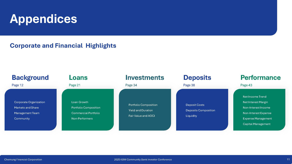 Chemung Financial Corporation Balance Sheet Restructuring and Subordinated Debt Raise 10 2025 KBW Community Bank Investor Conference Transaction Overview: Balance Sheet Optimization ▪ Sell ~$245M+ of low yielding AFS securities (Market Value) ▪ Pre - Tax Loss: ~$17.5M ▪ Average Yield on Securities Sold: ~2% ▪ WAL of Securities Sold: ~3 Yrs ▪ Allocate proceeds toward: ▪ Paying down liabilities ▪ Funding loan growth Subordinated Debt ▪ Raise $45M of subordinated debt to support key capital ratios Rationale ▪ Replace low yielding assets and run off expensive borrowings ▪ Transaction expected to result in improved profitability metrics; ROA, EPS, NIM, etc. ▪ Enhances capital position: decreases CRE ratio and increases TCE Revamped Pro Forma Profitability Healthy Pro Forma Capital 15.2% Total Risk Based Capital Ratio 12.0%+ CET1 Ratio 374% Reg. CRE Ratio 13% EPS Accr. 1.0% 2025 ROAA 3.2% 2025 NIM + ~10bps + ~20bps + ~180bps - ~2,600bps Revitalized balance sheet drives NIM expansion and enhanced earnings further build up capital ratios rapidly 7.5%+ TCE Ratio + ~30bps Pro Forma Snapshot (1) : 1.2% 2026 ROAA + ~20bps (1) Forward estimates are based on consensus analyst expectations.