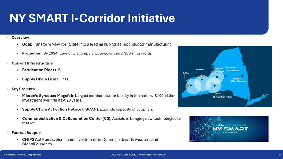 Competitive Advantage Share 2024 Deposits County 61.22% $852,755,000 Chemung 2.38% $382,727,000 Albany 74.94% $215,370,000 Schuyler 12.15% $181,514,000 Steuben 26.08% $150,610,000 Tioga 5.25% $138,312,000 Tompkins 7.03% $111,576,000 Cayuga 3.45% $121,141,000 Broome 1.51% $101,419,000 Saratoga 7.03% $64,796,000 Bradford (PA) 5.17% $38,771,000 Seneca 0.95% $33,584,000 Schenectady 2.65% $23,051,000 Cortland 0.01% $6,371,000 Erie $2,421,997,000 Total Market Share 15 Albany, NY 2025 KBW Community Bank Investor Conference Source: S&P Global, as of June 30, 2024 Chemung Financial Corporation NY SMART I - Corridor Initiative 16 ▪ Overview • Goal : Transform New York State into a leading hub for semiconductor manufacturing • Projection : By 2034, 25% of U.S. chips produced within a 350 - mile radius ▪ Current Infrastructure • Fabrication Plants : 5 • Supply Chain Firms : ~100 ▪ Key Projects • Micron’s Syracuse Megafab : Largest semiconductor facility in the nation. $100 billion investment over the next 20 years.