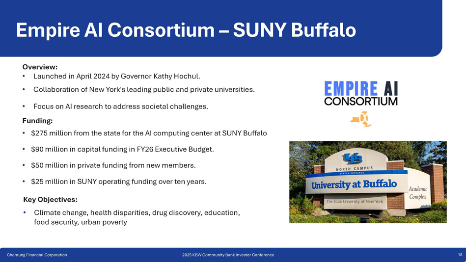 • $50 million in private funding from new members. • $25 million in SUNY operating funding over ten years. 2025 KBW Community Bank Investor Conference Overview: • Launched in April 2024 by Governor Kathy Hochul. • Collaboration of New York's leading public and private universities. • Focus on AI research to address societal challenges.