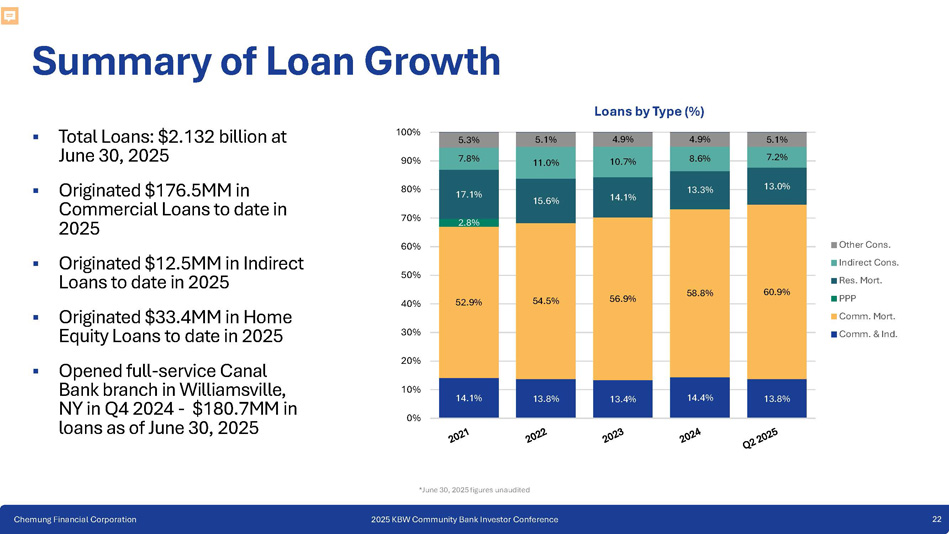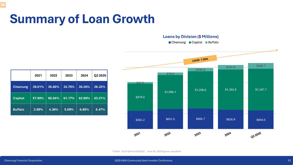 Chemung Financial Corporation 14.1% 13.8% 13.4% 14.4% 13.8% 52.9% 54.5% 56.9% 58.8% 60.9% 2.8% 17.1% 15.6% 14.1% 13.3% 13.0% 7.8% 11.0% 10.7% 8.6% 7.2% 5.3% 5.1% 4.9% 4.9% 5.1% 0% 10% 20% 30% 40% 50% 60% 70% 80% 90% 100% Loans by Type (%) Other Cons. Indirect Cons. Res. Mort. PPP Comm. Mort. Comm. & Ind. Summary of Loan Growth 22 ▪ Total Loans: $2.132 billion at June 30, 2025 ▪ Originated $176.5MM in Commercial Loans to date in 2025 ▪ Originated $12.5MM in Indirect Loans to date in 2025 ▪ Originated $33.4MM in Home Equity Loans to date in 2025 ▪ Opened full - service Canal Bank branch in Williamsville, NY in Q4 2024 - $180.7MM in loans as of June 30, 2025 *June 30, 2025 figures unaudited 2025 KBW Community Bank Investor Conference Chemung Financial Corporation $592.2 $651.5 $665.7 $626.9 $604.0 $879.0 $1,098.1 $1,206.6 $1,302.6 $1,347.7 $47.0 $79.8 $100.4 $141.9 $180.7 Loans by Division ($ Millions) Chemung Capital Buffalo Summary of Loan Growth Q2 2025 2024 2023 2022 2021 28.32% 30.26% 33.75% 35.60% 39.01% Chemung 63.21% 62.89% 61.17% 60.04% 57.90% Capital 8.47% 6.85% 5.09% 4.36% 3.09% Buffalo 23 *CAGR: 12/31/20 to 6/30/2025 *June 30, 2025 figures unaudited 2025 KBW Community Bank Investor Conference