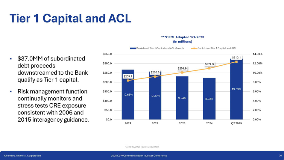 *June 30, 2025 figures unaudited 2025 KBW Community Bank Investor Conference Chemung Financial Corporation 10.68% 10.27% 9.24% 8.92% 13.03% $209.1 $230.6 $251.9 $274.3 $310.1 0.00% 2.00% 4.00% 6.00% 8.00% 10.00% 12.00% 14.00% $0.0 $50.0 $100.0 $150.0 $200.0 $250.0 $300.0 $350.0 2021 2022 2023 2024 Q2 2025 ***CECL Adopted 1/1/2023 (in millions) Bank-Level Tier 1 Capital and ACL Growth Bank-Level Tier 1 Capital and ACL Tier 1 Capital and ACL 26 ▪ $37.0MM of subordinated debt proceeds downstreamed to the Bank qualify as Tier 1 capital. ▪ Risk management function continually monitors and stress tests CRE exposure consistent with 2006 and 2015 interagency guidance.
