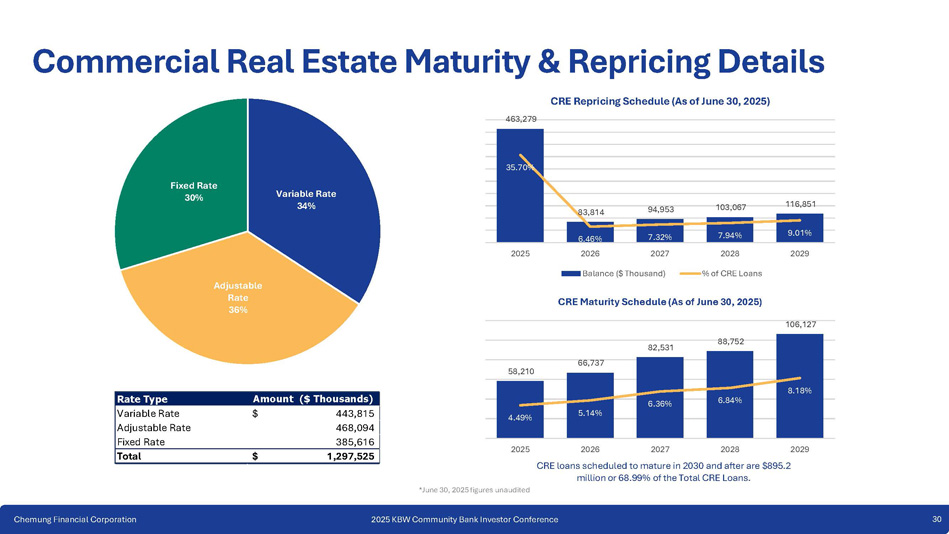 LTV Multifamily 437,117$ 33.7% 61.8% Retail 239,181 18.4% 58.0% Construction 98,504 7.6% Office 131,909 10.2% 60.9% Warehouse 97,761 7.5% 50.0% Hotel 66,194 5.1% 53.6% Other 226,859 17.5% 51.3% Total 1,297,525$ 100.0% 649 267 62 4 0 100 200 300 400 500 600 700 < $1.0MM $1.0MM - $5.0MM $5.0MM - $10.0MM > $10.0MM Number of CRE Loans by Balance Commercial Real Estate 28 *June 30, 2025 figures unaudited 2025 KBW Community Bank Investor Conference As of June 30, 2025 CRE Portfolio Metrics $1.32 million Average loan size $0.01 million / .00% of total CRE Past due 30 - 89 days $3.77 million / 0.29% of total CRE Nonaccrual $46.00 million / 3.55% of total CRE Special mention $5.17 million or 0.40% of total CRE Classified 14.20% of total CRE CRE < $1 million Chemung Financial Corporation Region 6/30/25 Balances ($ Thousands) % of CRE Loans Capital Region 814,866$ 62.8% Southern Tier & Finger Lakes 219,213 16.9% Western New York 202,124 15.6% Other 61,322 4.7% Total 1,297,525$ 100.0% © GeoNames, Microsoft, TomTom Powered by Bing CRE Loan Balances by Collateral County - 75,000,000.00 150,000,000.00 Series1 29 2025 KBW Community Bank Investor Conference $61.3 Million in CRE Loan Balances outside of New York State ▪ Focused on loans in existing markets.
