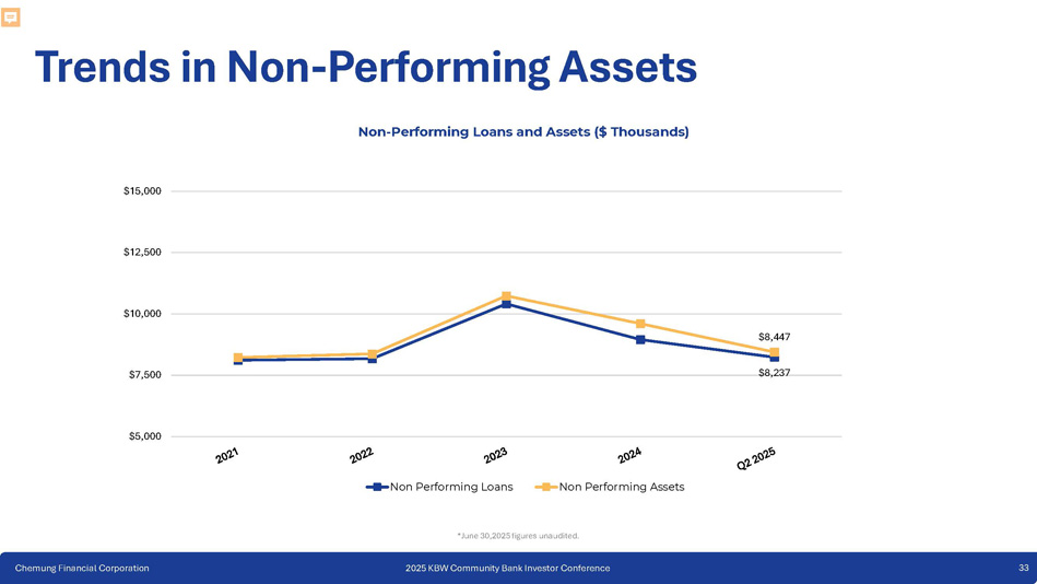 Chemung Financial Corporation Consumer Portfolio Composition 6/30/25 Balances ($ Thousands) % of Consumer Loans Residential Mortgage 278,221$ 51.48% Home Equity 55,898 10.35% HELOC 45,607 8.44% Indirect 153,321 28.37% Direct 7,368 1.36% Total 540,415$ 100.00% 0.43% 0.67% 1.34% 3.79% 1.98% 4.06% 5.29% 0.00% 1.00% 2.00% 3.00% 4.00% 5.00% 6.00% - 50,000 100,000 150,000 200,000 250,000 300,000 350,000 400,000 740 and above 720 to 739 700 to 719 680 to 699 660 to 679 640 to 659 Below 640 Consumer Loans by Credit Score ($ Thousands) Balance Percent Delinquent $540.4 Millon Residential Mortgage 52% Home Equity 10% HELOC 9% Indirect 28% Direct 1% Consumer Loans 31 *June 30, 2025 figures unaudited 2025 KBRA Meeting As of June 30, 2025 Consumer Portfolio Metrics $4.06 million / 0.75% of consumer Past due 30 - 89 days $3.59 million / 0.66% of consumer Nonaccrual $487,000 / 0.18% annualized YTD Net Charge Offs Chemung Financial Corporation 0.30% 0.39% 0.00% 0.10% 0.20% 0.30% 0.40% 0.50% 0.60% Non - Performing Loans and Assets (% of Total) Non-performing assets to total assets Non-performing loans to total loans Trends in Non - Performing Assets 32 *June 30, 2025 figures unaudited.