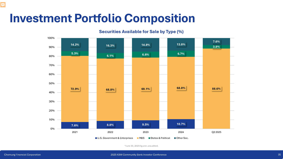 2025 KBW Community Bank Investor Conference Chemung Financial Corporation $8,237 $8,447 $5,000 $7,500 $10,000 $12,500 $15,000 Non - Performing Loans and Assets ($ Thousands) Non Performing Loans Non Performing Assets Trends in Non - Performing Assets 33 *June 30,2025 figures unaudited.
