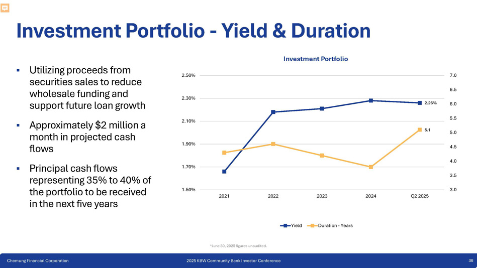 2025 KBW Community Bank Investor Conference Chemung Financial Corporation 7.6% 8.8% 9.5% 10.7% 72.9% 68.8% 69.1% 68.8% 88.6% 5.3% 6.1% 6.6% 6.7% 3.8% 14.2% 16.3% 14.8% 13.8% 7.6% 0% 10% 20% 30% 40% 50% 60% 70% 80% 90% 100% 2021 2022 2023 2024 Q2 2025 Securities Available for Sale by Type (%) U.S. Government & Enterprises MBS States & Political Other Sec. Investment Portfolio Composition 35 *June 30, 2025 figures unaudited.