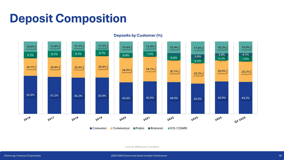 2025 KBW Community Bank Investor Conference Chemung Financial Corporation 0.00% 1.00% 2.00% 3.00% 4.00% 5.00% 6.00% 2021 2022 2023 2024 Q2 2025 Cost of Deposits NOW Savings and Money Market Time Deposits Brokered Deposits Total Cost of Interest Bearing Deposits 34.3% 31.5% 26.9% 26.1% 25.3% 13.2% 11.7% 12.0% 12.8% 14.1% 30.4% 27.5% 25.7% 24.8% 25.9% 13.0% 12.0% 10.2% 10.3% 9.6% 9.1% 14.1% 19.3% 22.2% 21.0% 3.2% 5.9% 3.8% 4.1% 2021 2022 2023 2024 Q2 2025 Account Types (%) Non-Interest Bearing DDA Interest Bearing DDA Money Market Savings Time Deposit Brokered Deposits Q2 2025 2024 2023 2022 2021 Rate 1.56% 1.78% 1.10% 0.15% 0.08% NOW 1.89% 2.02% 1.45% 0.24% 0.10% Savings and Money Market 3.60% 4.22% 3.31% 1.08% 0.83% Time Deposits 4.49% 5.29% 5.22% 2.88% Brokered Deposits 2.47% 2.79% 2.11% 0.44% 0.22% Total Cost of Interest Bearing Deposits 1.84% 2.07% 1.51% 0.30% 0.15% Total Cost of Deposits Deposit Costs 39 • 2025 Total Deposits $2.469B; an increase of $72.1 million from December 31, 2024 • 2025 Brokered Deposits $100.0 million; an increase of $7.8 million from December 31, 2024 • All brokered deposits fully repaid as of July 2025 *June 30, 2025 figures unaudited.
