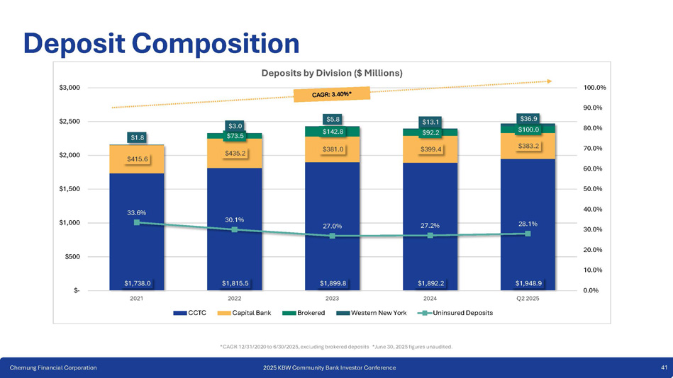2025 KBW Community Bank Investor Conference Chemung Financial Corporation 52.8% 51.2% 50.2% 50.4% 43.8% 45.0% 44.0% 42.0% 44.9% 44.3% 24.1% 26.9% 28.4% 29.4% 34.0% 34.1% 30.1% 28.2% 29.0% 28.2% 9.1% 9.1% 9.1% 8.7% 6.6% 7.5% 6.8% 6.3% 6.1% 7.6% 5.9% 3.8% 4.1% 14.0% 12.8% 12.3% 11.5% 15.6% 13.4% 15.9% 17.6% 16.2% 15.8% Deposits by Customer (%) Consumer Commerical Public Brokered ICS / CDARS Deposit Composition 40 *June 30, 2025 figures unaudited.