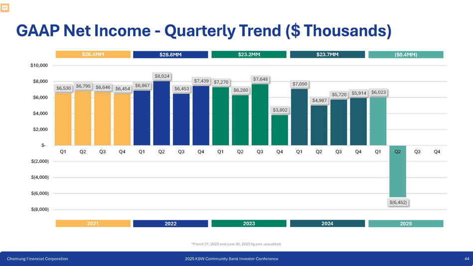2025 KBW Community Bank Investor Conference Chemung Financial Corporation $6,530 $6,795 $6,646 $6,454 $6,867 $8,024 $6,453 $7,439 $7,270 $6,280 $7,648 $3,802 $7,050 $4,987 $5,720 $5,914 $6,023 $(6,452) $(8,000) $(6,000) $(4,000) $(2,000) $- $2,000 $4,000 $6,000 $8,000 $10,000 Q1 Q2 Q3 Q4 Q1 Q2 Q3 Q4 Q1 Q2 Q3 Q4 Q1 Q2 Q3 Q4 Q1 Q2 Q3 Q4 GAAP Net Income - Quarterly Trend ($ Thousands) 44 *March 31, 2025 and June 30, 2025 figures unaudited.