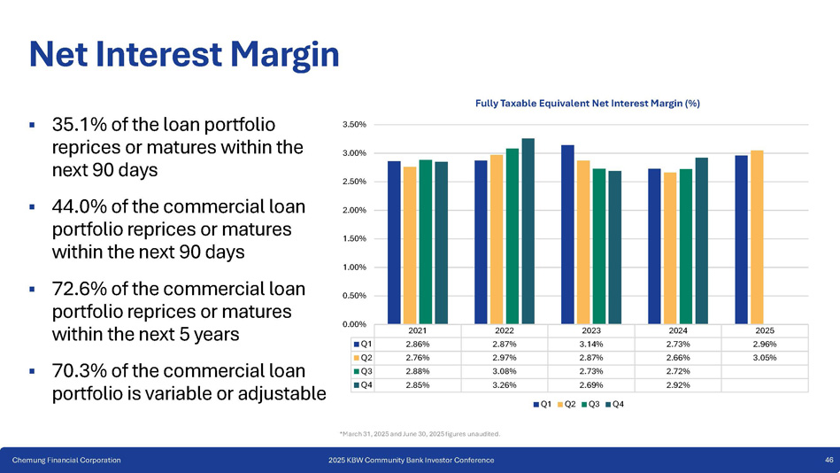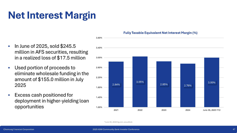 2025 KBW Community Bank Investor Conference $26.4MM $28.8MM $25.0MM $23.7MM $12.3MM 2021 2022 2023 2024 2025 Chemung Financial Corporation 2021 2022 2023 2024 2025 Q1 2.86% 2.87% 3.14% 2.73% 2.96% Q2 2.76% 2.97% 2.87% 2.66% 3.05% Q3 2.88% 3.08% 2.73% 2.72% Q4 2.85% 3.26% 2.69% 2.92% 0.00% 0.50% 1.00% 1.50% 2.00% 2.50% 3.00% 3.50% Fully Taxable Equivalent Net Interest Margin (%) Q1 Q2 Q3 Q4 Net Interest Margin 46 *March 31, 2025 and June 30, 2025 figures unaudited. ▪ 35.1% of the loan portfolio reprices or matures within the next 90 days ▪ 44.0% of the commercial loan portfolio reprices or matures within the next 90 days ▪ 72.6% of the commercial loan portfolio reprices or matures within the next 5 years ▪ 70.3% of the commercial loan portfolio is variable or adjustable 2025 KBW Community Bank Investor Conference Chemung Financial Corporation 2.84% 3.05% 2.85% 2.76% 3.00% 1.00% 1.40% 1.80% 2.20% 2.60% 3.00% 3.40% 3.80% 2021 2022 2023 2024 June 30, 2025 YTD Fully Taxable Equivalent Net Interest Margin (%) Net Interest Margin 47 ▪ In June of 2025, sold $245.5 million in AFS securities, resulting in a realized loss of $17.5 million ▪ Used portion of proceeds to eliminate wholesale funding in the amount of $155.0 million in July 2025 ▪ Excess cash positioned for deployment in higher - yielding loan opportunities *June 30, 2025 figures unaudited.