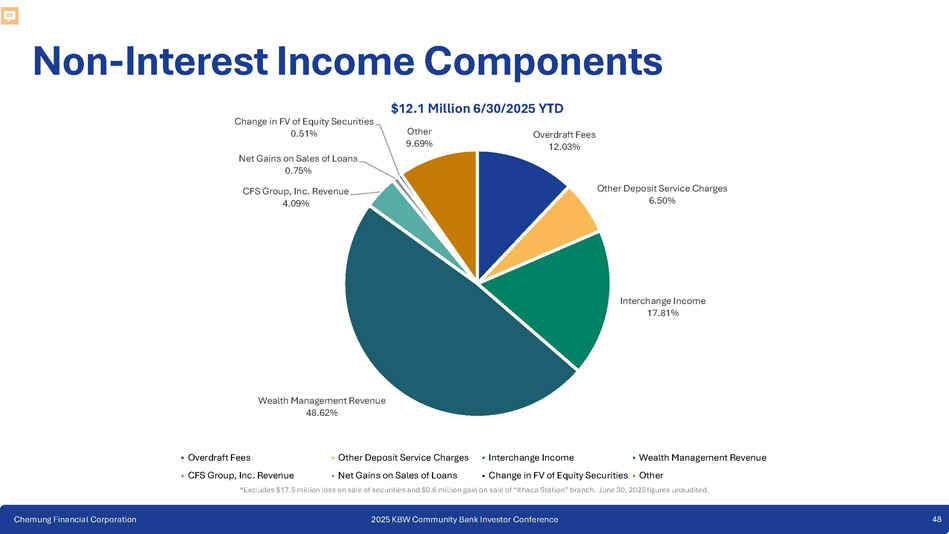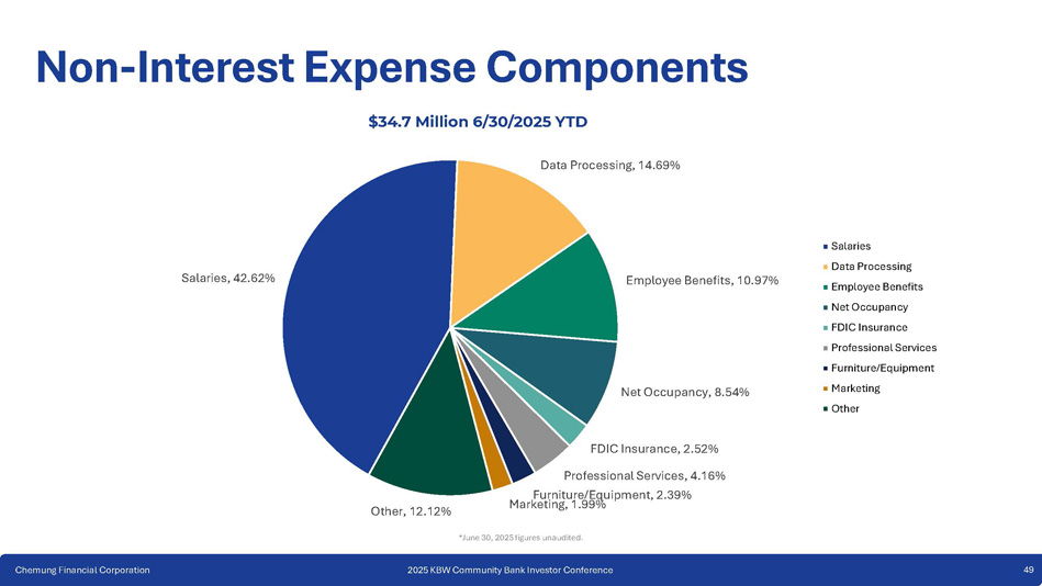 2025 KBW Community Bank Investor Conference Chemung Financial Corporation Overdraft Fees 12.03% Other Deposit Service Charges 6.50% Interchange Income 17.81% Wealth Management Revenue 48.62% CFS Group, Inc. Revenue 4.09% Net Gains on Sales of Loans 0.75% Change in FV of Equity Securities 0.51% Other 9.69% $12.1 Million 6/30/2025 YTD Overdraft Fees Other Deposit Service Charges Interchange Income Wealth Management Revenue CFS Group, Inc. Revenue Net Gains on Sales of Loans Change in FV of Equity Securities Other Non - Interest Income Components 48 *Excludes $17.5 million loss on sale of securities and $0.6 million gain on sale of “Ithaca Station” branch. June 30, 2025 f igu res unaudited.