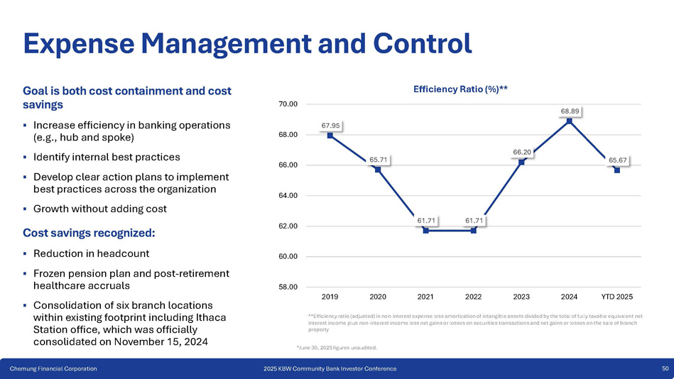 2025 KBW Community Bank Investor Conference Chemung Financial Corporation Salaries , 42.62% Data Processing , 14.69% Employee Benefits , 10.97% Net Occupancy , 8.54% FDIC Insurance , 2.52% Professional Services , 4.16% Furniture/Equipment , 2.39% Marketing , 1.99% Other , 12.12% $34.7 Million 6/30/2025 YTD Salaries Data Processing Employee Benefits Net Occupancy FDIC Insurance Professional Services Furniture/Equipment Marketing Other Non - Interest Expense Components 49 *June 30, 2025 figures unaudited.