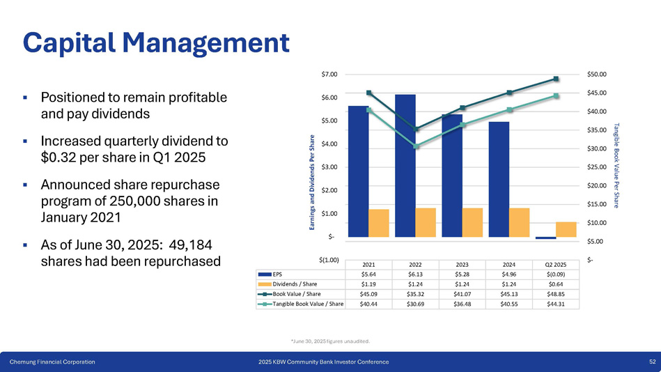 2025 KBW Community Bank Investor Conference Chemung Financial Corporation 8.06% 8.23% 8.62% 9.18% 8.96% 12.96% 11.54% 12.08% 12.30% 12.00% 14.21% 12.57% 13.26% 13.35% 15.16% 7.91% 5.51% 6.45% 7.02% 7.53% 4% 6% 8% 10% 12% 14% 16% Chemung Financial Corporation - Capital Ratios (%) Tier 1 Leverage Tier 1 Capital / CET1 Total Capital TCE Ratio Capital Management 51 ▪ $45.0 million in Subordinated Notes issued on June 10, 2025 qualify as tier 2 capital at the holding company ▪ Grow capital organically through earnings ▪ Continually evaluating capital strategies ▪ Positive stress testing results *June 30, 2025 figures unaudited.