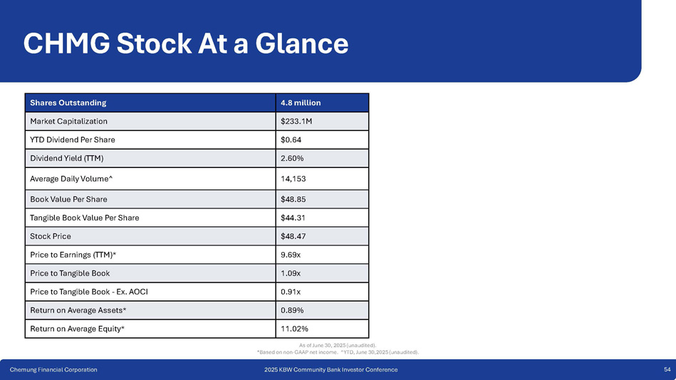 Chemung Financial Corporation GAAP to Non - GAAP Reconciliation 53 2025 KBW Community Bank Investor Conference *June 30, 2025 figures unaudited. Dollars in Thousands June 30, 2025 QTD June 30, 2025 YTD Net interest income (GAAP) 20,808$ 40,625$ Fully taxable equivalent adjustment 76 156 Fully taxable equivalent net interest income (non-GAAP) 20,884$ 40,781$ Non-interest income (GAAP) (10,705)$ (4,816)$ Less: net (gains) losses on security transactions 17,498 17,498 Less: (gain) loss on sale of branch property (629) (629) Adjusted non-interest income (non-GAAP) 6,164$ 12,053$ Non-interest expense (GAAP) 17,769$ 34,696$ Efficiency ratio (unadjusted) 175.88% 96.89% Efficiency ratio (adjusted) 65.69% 65.67% Dollars in Thousands June 30, 2025 QTD June 30, 2025 YTD Reported net income (GAAP) (6,452)$ (429)$ Net (gains) losses on security transactions (net of tax) 13,237 13,237 Net (gain) loss on sale of branch property (net of tax) (463) (463) Net income (non-GAAP) 6,322$ 12,345$ Average basic and diluted shares oustanding 4,808 4,798 Reported basic and diluted earnings per share (GAAP) (1.35)$ (0.09)$ Reported return on average assets (GAAP) -0.46% -0.03% Reported return on average equity (GAAP) -5.63% -0.38% Basic and diluted earnings per share (non-GAAP) 1.31$ 2.57$ Return on average assets (non-GAAP) 0.90% 0.89% Return on average equity (non-GAAP) 11.07% 11.02% Chemung Financial Corporation 4.8 million Shares Outstanding $233.1M Market Capitalization $0.64 YTD Dividend Per Share 2.60% Dividend Yield (TTM) 14,153 Average Daily Volume^ $48.85 Book Value Per Share $44.31 Tangible Book Value Per Share $48.47 Stock Price 9.69x Price to Earnings (TTM)* 1.09x Price to Tangible Book 0.91x Price to Tangible Book - Ex.