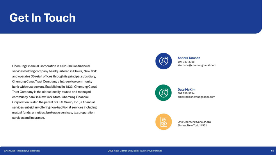 54 2025 KBW Community Bank Investor Conference Chemung Financial Corporation One Chemung Canal Plaza Elmira, New York 14901 Anders Tomson 607 737 - 3756 atomson@chemungcanal.com Get In Touch Chemung Financial Corporation is a $2.9 billion financial services holding company headquartered in Elmira, New York and operates 30 retail offices through its principal subsidiary, Chemung Canal Trust Company, a full - service community bank with trust powers. Established in 1833, Chemung Canal Trust Company is the oldest locally - owned and managed community bank in New York State. Chemung Financial Corporation is also the parent of CFS Group, Inc., a financial services subsidiary offering non - traditional services including mutual funds, annuities, brokerage services, tax preparation services and insurance. Dale McKim 607 737 - 3714 dmckim@chemungcanal.com 55 2025 KBW Community Bank Investor Conference
