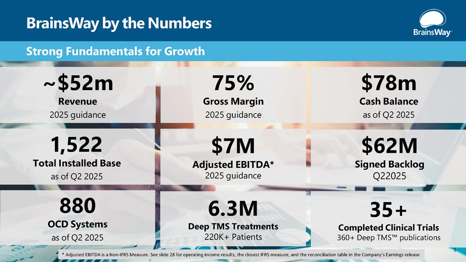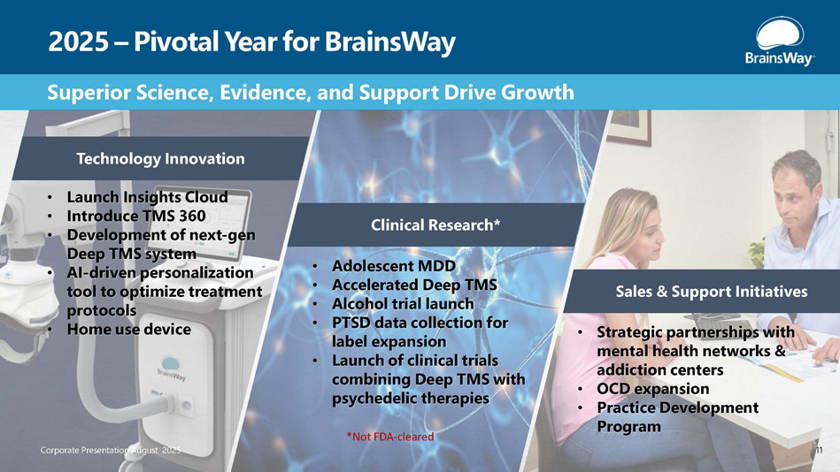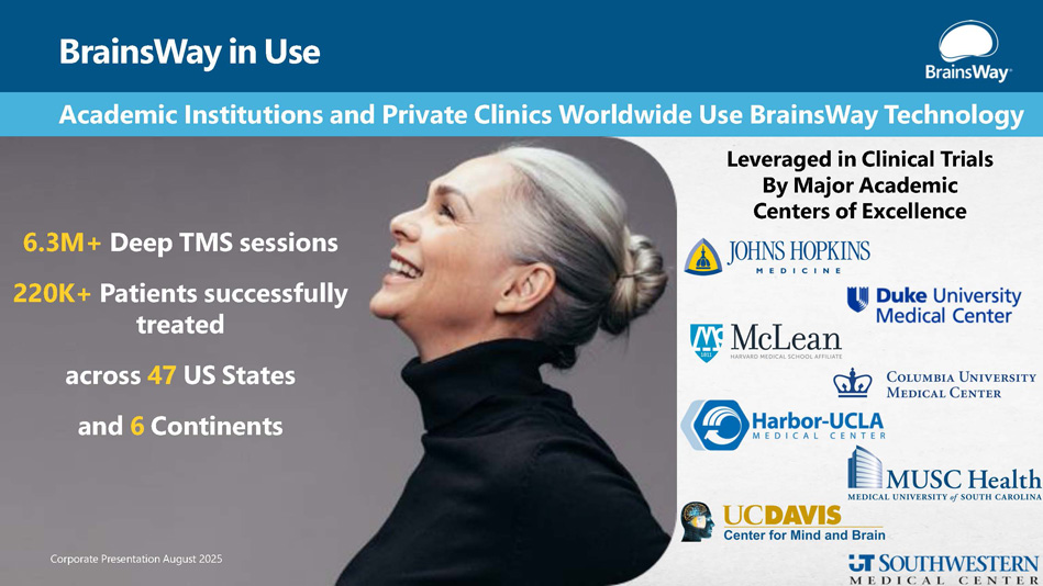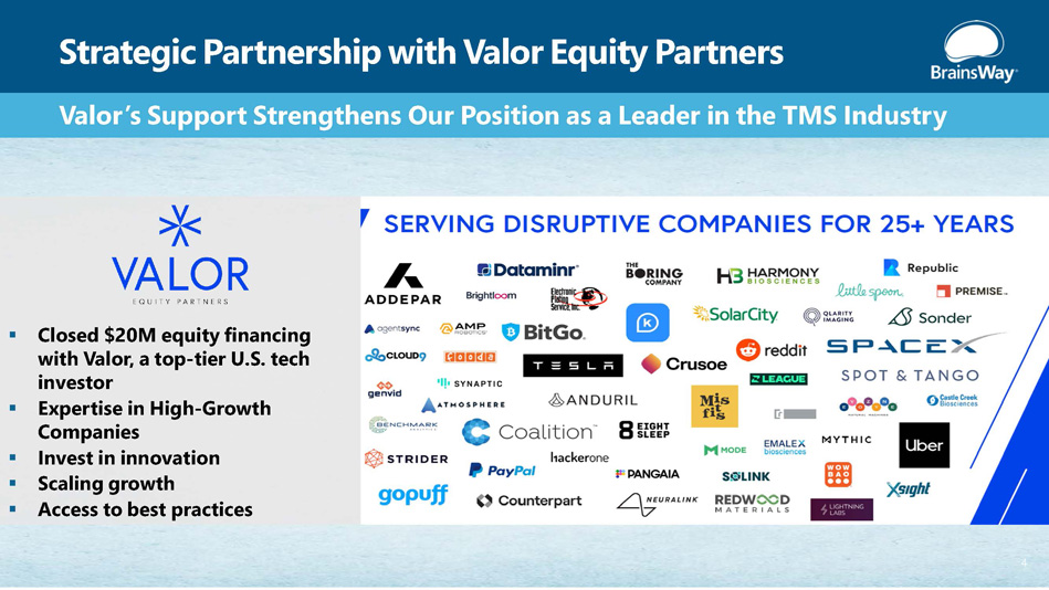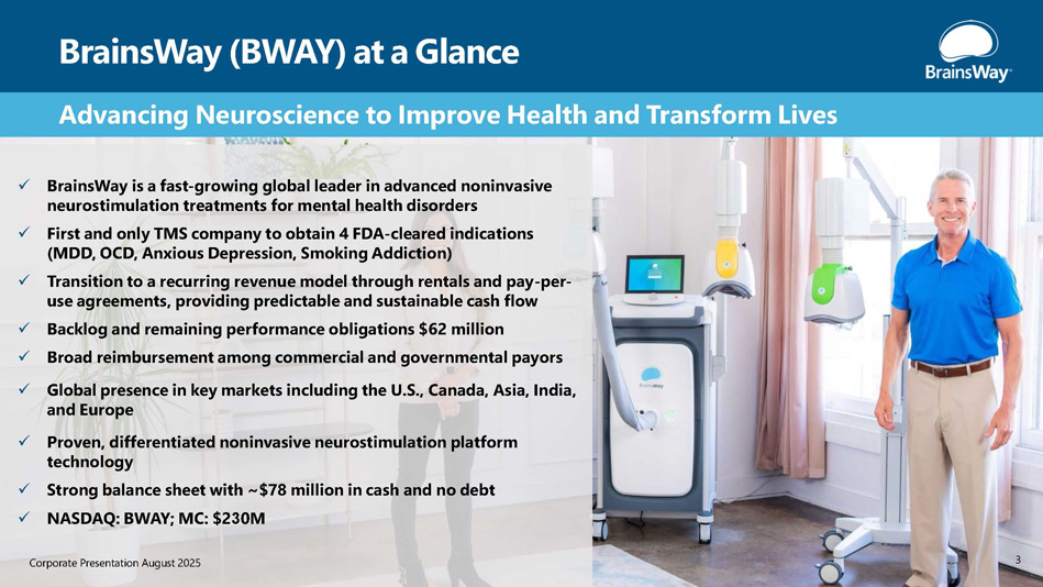 Corporate Presentation May 2025 2 BrainsWay (BWAY) at a Glance Advancing Neuroscience to Improve Health and Transform Lives x BrainsWay is a fast - growing global leader in advanced noninvasive neurostimulation treatments for mental health disorders x First and only TMS company to obtain 4 FDA - cleared indications (MDD, OCD, Anxious Depression, Smoking Addiction) x Transition to a recurring revenue model through rentals and pay - per - use agreements, providing predictable and sustainable cash flow x Backlog and remaining performance obligations $62 million x Broad reimbursement among commercial and governmental payors x Global presence in key markets including the U.S., Canada, Asia, India, and Europe x Proven, differentiated noninvasive neurostimulation platform technology x Strong balance sheet with ~$78 million in cash and no debt x NASDAQ: BWAY; MC: $2 3 0M 3 Corporate Presentation August 2025 Strategic Partnership with Valor Equity Partners Valor’s Support Strengthens Our Position as a Leader in the TMS Industry ▪ Closed $ 20 M equity financing with Valor, a top - tier U . S . tech investor ▪ Expertise in High - Growth Companies ▪ Invest in innovation ▪ Scaling growth ▪ Access to best practices 4