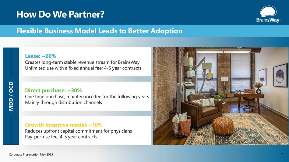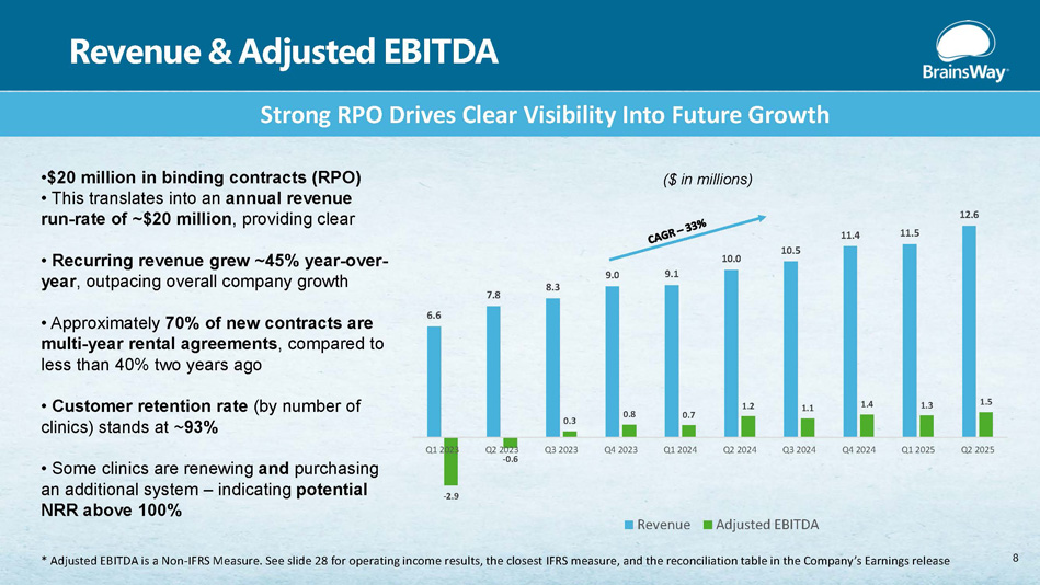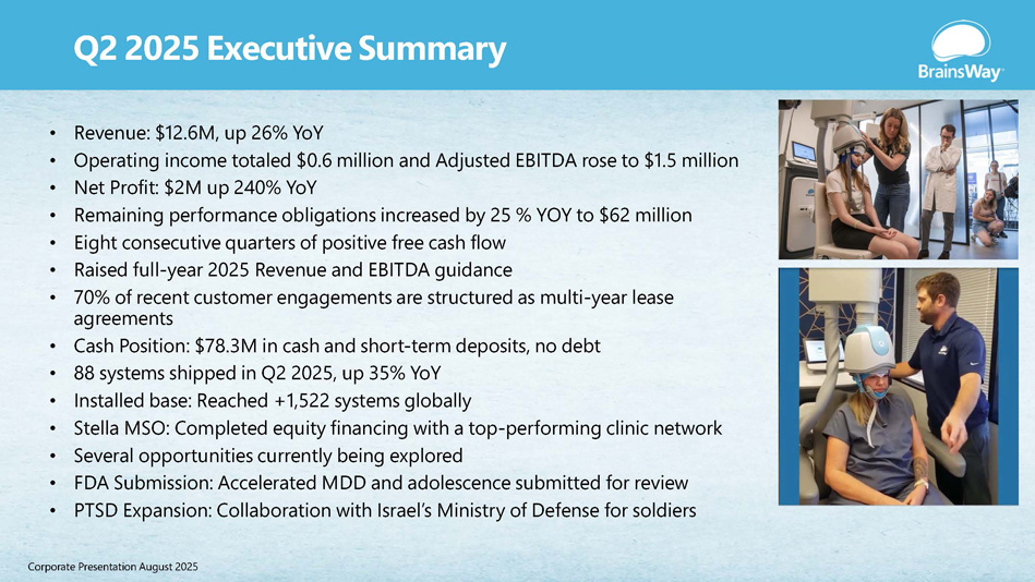 See slide 28 for operating income results, the closest IFRS measure, and the reconciliation table in the Company’s Earnings release Q2 2025 Executive Summary • Revenue: $12.6M, up 26% YoY • Operating income totaled $0.6 million and Adjusted EBITDA rose to $1.5 million • Net Profit: $2M up 240% YoY • Remaining performance obligations increased by 25 % YOY to $62 million • Eight consecutive quarters of positive free cash flow • Raised full - year 2025 Revenue and EBITDA guidance • 70% of recent customer engagements are structured as multi - year lease agreements • Cash Position: $78.3M in cash and short - term deposits, no debt • 88 systems shipped in Q2 2025, up 35% YoY • Installed base: Reached +1,522 systems globally • Stella MSO: Completed equity financing with a top - performing clinic network • Several opportunities currently being explored • FDA Submission: Accelerated MDD and adolescence submitted for review • PTSD Expansion: Collaboration with Israel’s Ministry of Defense for soldiers Corporate Presentation August 2025 MDD / OCD Lease: ~60% Creates long - term stable revenue stream for BrainsWay Unlimited use with a fixed annual fee; 4 - 5 year contracts Direct purchase: ~30% One time purchase; maintenance fee for the following years Mainly through distribution channels Growth Incentive model: ~10% Reduces upfront capital commitment for physicians Pay - per - use fee; 4 - 5 year contracts Flexible Business Model Leads to Better Adoption Corporate Presentation May 2025 7 How Do We Partner?