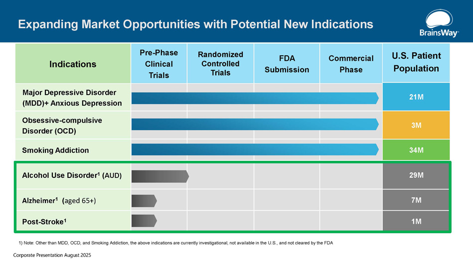 and Israel 30,000+ patients treated to date Known for clinical excellence, operational strength, and innovative care delivery Strategic Partnership with Stella Corporate Presentation August 2025 Superior Science, Evidence, and Support Drive Growth 2025 – Pivotal Year for BrainsWay Clinical Research* Sales & Support Initiatives Technology Innovation • Launch Insights Cloud • Introduce TMS 360 • Development of next - gen Deep TMS system • AI - driven personalization tool to optimize treatment protocols • Home use device • Adolescent MDD • Accelerated Deep TMS • Alcohol trial launch • PTSD data collection for label expansion • Launch of clinical trials combining Deep TMS with psychedelic therapies • Strategic partnerships with mental health networks & addiction centers • OCD expansion • Practice Development Program Corporate Presentation August 2025 11 *Not FDA - cleared U.S. Patient Population Commercial Phase FDA Submission Randomized Controlled Trials Pre - Phase Clinical Trials Indications 21M Major Depressive Disorder (MDD)+ Anxious Depression 3M Obsessive - compulsive Disorder (OCD) 34M Smoking Addiction 29M Alcohol Use Disorder 1 ( AUD) 7M Alzheimer 1 ( aged 65+) 1M Post - Stroke 1 Expanding Market Opportunities with Potential New Indications 1) Note: Other than MDD, OCD, and Smoking Addiction, the above indications are currently investigational, not available in the U.S., and not cleared by the FDA Corporate Presentation August 2025