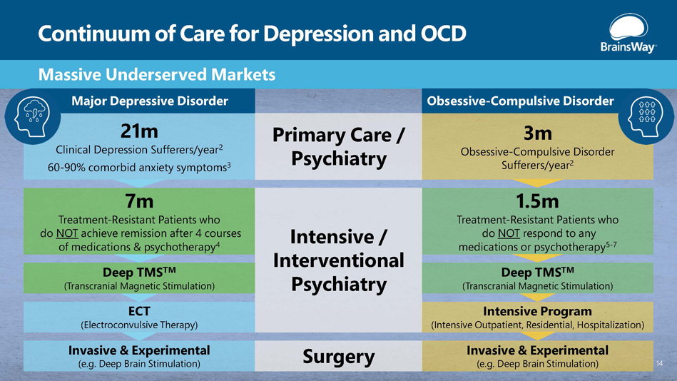 BrainsWay in Use Corporate Presentation April 2025 Academic Institutions and Private Clinics Worldwide Use BrainsWay Technology Leveraged in Clinical Trials By Major Academic Centers of Excellence 6.3M+ Deep TMS sessions 220K+ Patients successfully treated across 47 US States and 6 Continents Corporate Presentation August 2025 Continuum of Care for Depression and OCD Massive Underserved Markets Primary Care / Psychiatry 21m Clinical Depression Sufferers/year 2 60 - 90% comorbid anxiety symptoms 3 7m Treatment - Resistant Patients who do NOT achieve remission after 4 courses of medications & psychotherapy 4 3m Obsessive - Compulsive Disorder Sufferers/year 2 1.5m Treatment - Resistant Patients who do NOT respond to any medications or psychotherapy 5 - 7 Intensive / Interventional Psychiatry Invasive & Experimental (e.g.