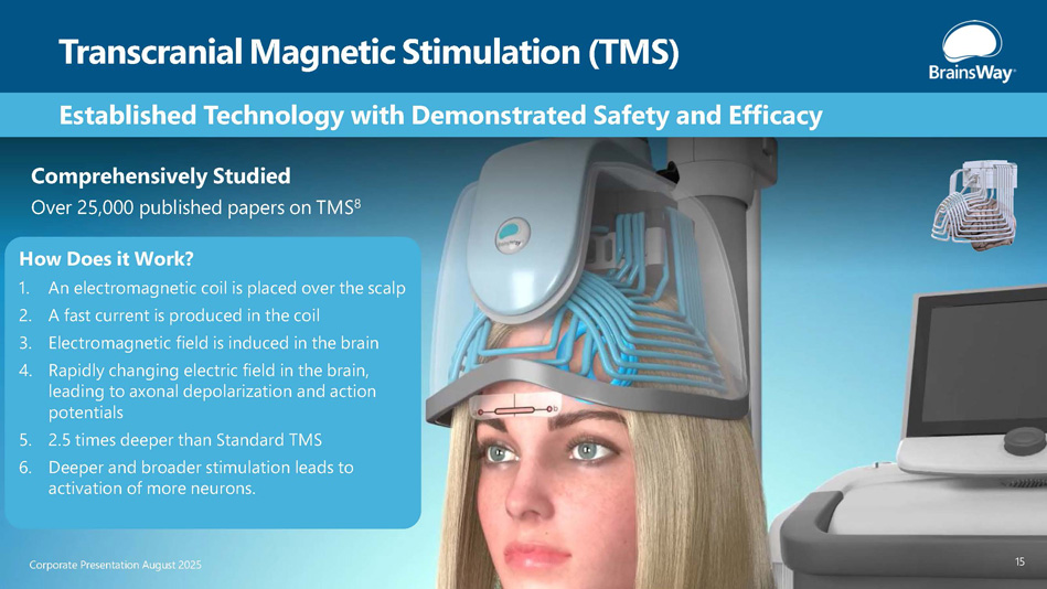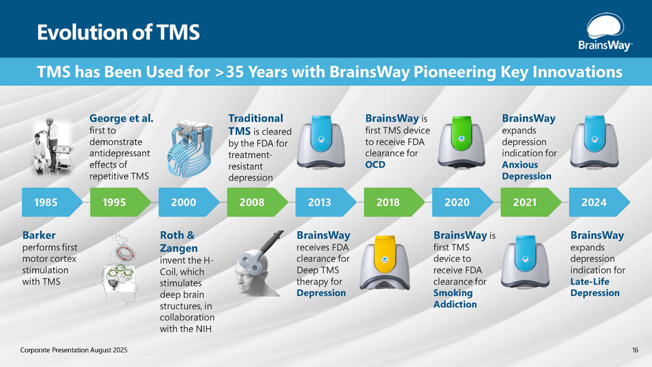 An electromagnetic coil is placed over the scalp 2. A fast current is produced in the coil 3. Electromagnetic field is induced in the brain 4. Rapidly changing electric field in the brain, leading to axonal depolarization and action potentials 5. 2.5 times deeper than Standard TMS 6. Deeper and broader stimulation leads to activation of more neurons. 15 Corporate Presentation August 2025 TMS has Been Used for >35 Years with BrainsWay Pioneering Key Innovations Evolution of TMS 1985 George et al.