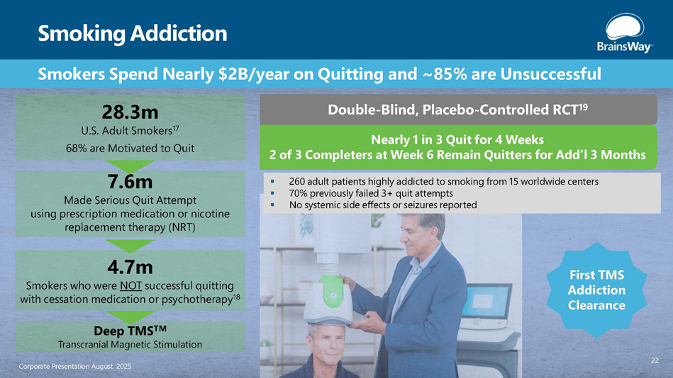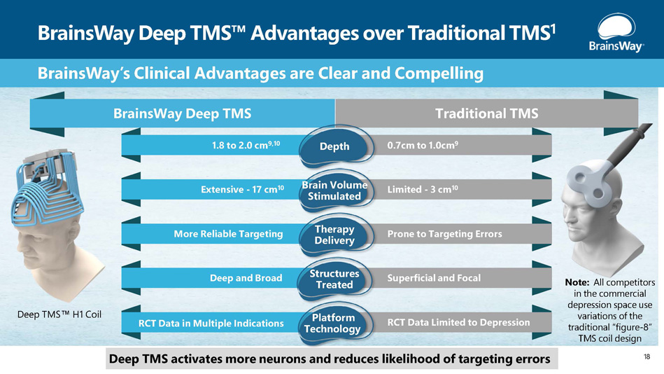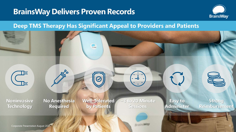 first to demonstrate antidepressant effects of repetitive TMS Barker performs first motor cortex stimulation with TMS Roth & Zangen invent the H - Coil, which stimulates deep brain structures, in collaboration with the NIH BrainsWay receives FDA clearance for Deep TMS therapy for Depression BrainsWay is first TMS device to receive FDA clearance for OCD BrainsWay is first TMS device to receive FDA clearance for Smoking Addiction BrainsWay expands depression indication for Late - Life Depression BrainsWay expands depression indication for Anxious Depression 1995 2000 Traditional TMS is cleared by the FDA for treatment - resistant depression 2008 2013 2018 2020 2021 2024 16 Corporate Presentation August 2025 BrainsWay Delivers Proven Records Deep TMS Therapy Has Significant Appeal to Providers and Patients Strong Reimbursement Easy to Administer ~3 to 20 Minute Sessions Well - Tolerated by Patients No Anesthesia Required Noninvasive Technology 17 Corporate Presentation August 2025