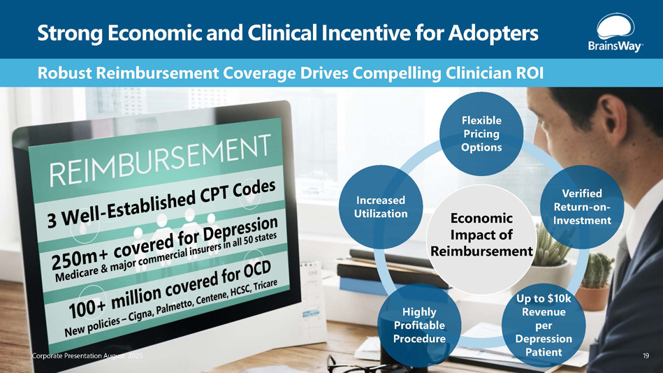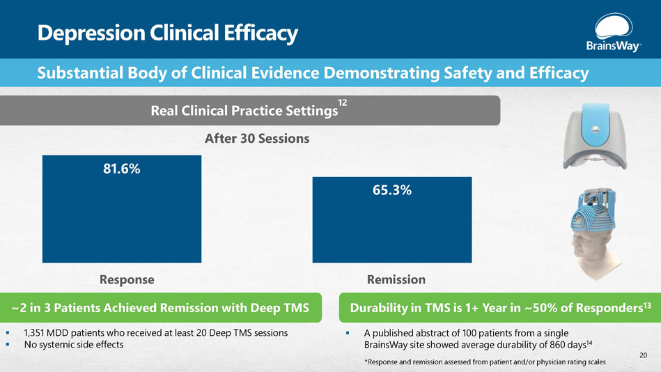 BrainsWay Deep TMS Advantages over Traditional TMS 1 Deep TMS H1 Coil BrainsWay’s Clinical Advantages are Clear and Compelling BrainsWay Deep TMS Traditional TMS 1.8 to 2.0 cm 9,10 0.7cm to 1.0cm 9 Depth Extensive - 17 cm 10 Limited - 3 cm 10 Brain Volume Stimulated More Reliable Targeting Prone to Targeting Errors Therapy Delivery Deep and Broad Superficial and Focal Structures Treated RCT Data in Multiple Indications RCT Data Limited to Depression Platform Technology Deep TMS activates more neurons and reduces likelihood of targeting errors Note: All competitors in the commercial depression space use variations of the traditional “figure - 8” TMS coil design 18 Robust Reimbursement Coverage Drives Compelling Clinician ROI Strong Economic and Clinical Incentive for Adopters Flexible Pricing Options Verified Return - on - Investment Up to $10k Revenue per Depression Patient Highly Profitable Procedure Increased Utilization Economic Impact of Reimbursement Corporate Presentation August 2025 19