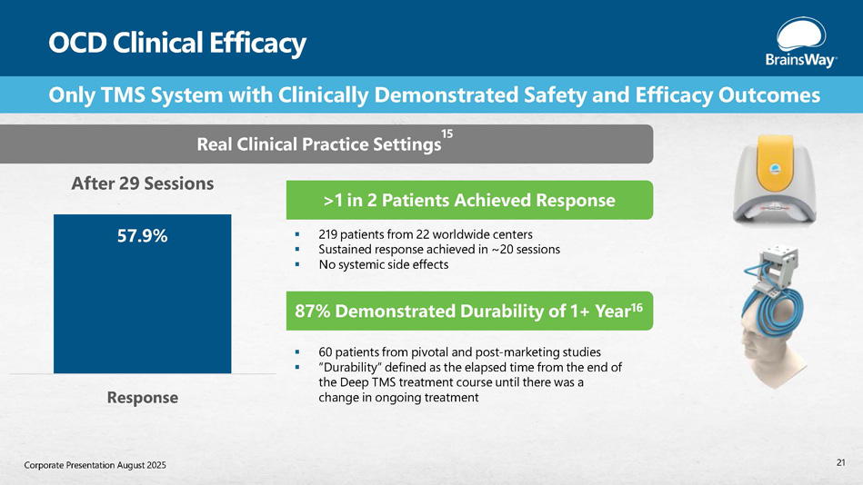 Depression Clinical Efficacy 81.6% 65.3% Substantial Body of Clinical Evidence Demonstrating Safety and Efficacy Real Clinical Practice Settings 12 After 30 Sessions Response ~2 in 3 Patients Achieved Remission with Deep TMS ▪ 1,351 MDD patients who received at least 20 Deep TMS sessions ▪ No systemic side effects Remission Durability in TMS is 1+ Year in ~50% of Responders 13 ▪ A published abstract of 100 patients from a single BrainsWay site showed average durability of 860 days 14 20 *Response and remission assessed from patient and/or physician rating scales OCD Clinical Efficacy >1 in 2 Patients Achieved Response ▪ 219 patients from 22 worldwide centers ▪ Sustained response achieved in ~20 sessions ▪ No systemic side effects 57.9% Response Only TMS System with Clinically Demonstrated Safety and Efficacy Outcomes Real Clinical Practice Settings 15 After 29 Sessions ▪ 60 patients from pivotal and post - marketing studies ▪ ”Durability” defined as the elapsed time from the end of the Deep TMS treatment course until there was a change in ongoing treatment 21 Corporate Presentation August 2025 87% Demonstrated Durability of 1+ Year 16