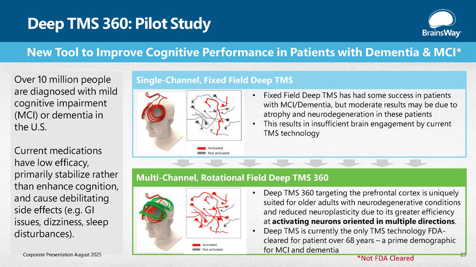Adult Smokers 17 68% are Motivated to Quit 4.7m Smokers who were NOT successful quitting with cessation medication or psychotherapy 18 Deep TMS TM Transcranial Magnetic Stimulation 7.6m Made Serious Quit Attempt using prescription medication or nicotine replacement therapy (NRT) First TMS Addiction Clearance ▪ 260 adult patients highly addicted to smoking from 15 worldwide centers ▪ 70% previously failed 3+ quit attempts ▪ No systemic side effects or seizures reported Double - Blind, Placebo - Controlled RCT 19 Nearly 1 in 3 Quit for 4 Weeks 2 of 3 Completers at Week 6 Remain Quitters for Add’l 3 Months 22 Corporate Presentation August 2025 New Tool to Improve Cognitive Performance in Patients with Dementia & MCI* Deep TMS 360: Pilot Study 23 Single - Channel, Fixed Field Deep TMS Multi - Channel, Rotational Field Deep TMS 360 • Fixed Field Deep TMS has had some success in patients with MCI/Dementia, but moderate results may be due to atrophy and neurodegeneration in these patients • This results in insufficient brain engagement by current TMS technology • Deep TMS 360 targeting the prefrontal cortex is uniquely suited for older adults with neurodegenerative conditions and reduced neuroplasticity due to its greater efficiency at activating neurons oriented in multiple directions . • Deep TMS is currently the only TMS technology FDA - cleared for patient over 68 years – a prime demographic for MCI and dementia Over 10 million people are diagnosed with mild cognitive impairment (MCI) or dementia in the U.S. Current medications have low efficacy, primarily stabilize rather than enhance cognition, and cause debilitating side effects (e.g. GI issues, dizziness, sleep disturbances).