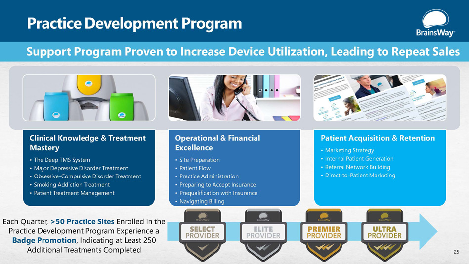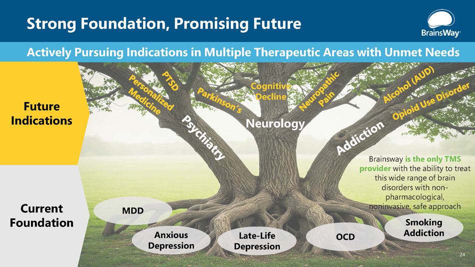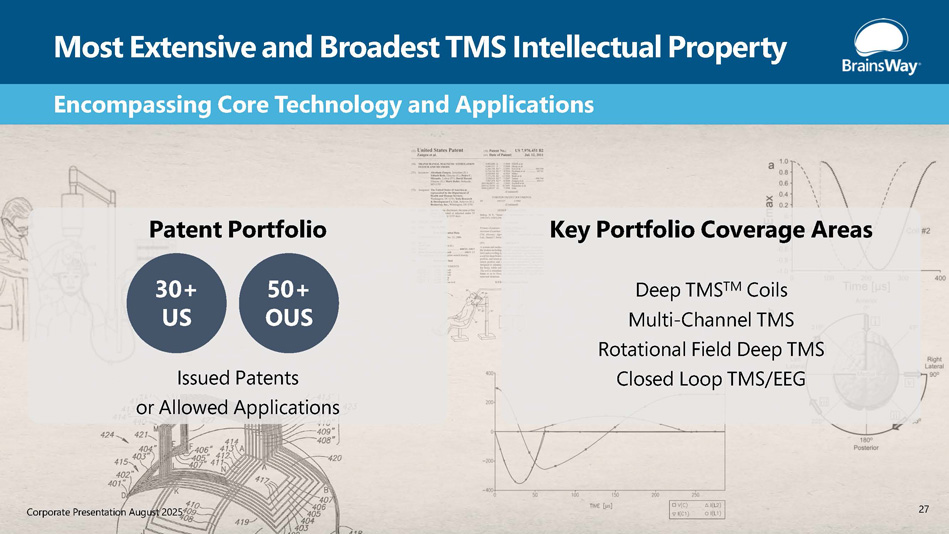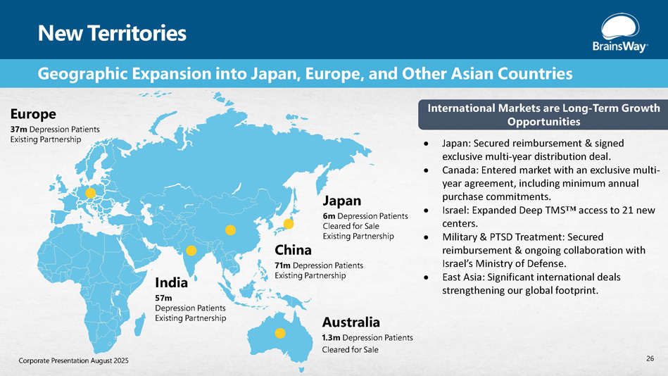 Corporate Presentation August 2025 *Not FDA Cleared Strong Foundation, Promising Future 24 MDD Anxious Depression Late - Life Depression OCD Neurology Actively Pursuing Indications in Multiple Therapeutic Areas with Unmet Needs Cognitive Decline Current Foundation Future Indications Brainsway is the only TMS provider with the ability to treat this wide range of brain disorders with non - pharmacological, noninvasive, safe approach Smoking Addiction Support Program Proven to Increase Device Utilization, Leading to Repeat Sales Practice Development Program 25 Clinical Knowledge & Treatment Mastery • The Deep TMS System • Major Depressive Disorder Treatment • Obsessive - Compulsive Disorder Treatment • Smoking Addiction Treatment • Patient Treatment Management Operational & Financial Excellence • Site Preparation • Patient Flow • Practice Administration • Preparing to Accept Insurance • Prequalification with Insurance • Navigating Billing Patient Acquisition & Retention • Marketing Strategy • Internal Patient Generation • Referral Network Building • Direct - to - Patient Marketing Each Quarter, >50 Practice Sites Enrolled in the Practice Development Program Experience a Badge Promotion , Indicating at Least 250 Additional Treatments Completed New Territories Europe 37m Depression Patients Existing Partnership India 57m Depression Patients Existing Partnership China 71m Depression Patients Existing Partnership Japan 6m Depression Patients Cleared for Sale Existing Partnership Australia 1.3m Depression Patients Cleared for Sale Geographic Expansion into Japan, Europe, and Other Asian Countries International Markets are Long - Term Growth Opportunities Japan: Secured reimbursement & signed exclusive multi - year distribution deal.