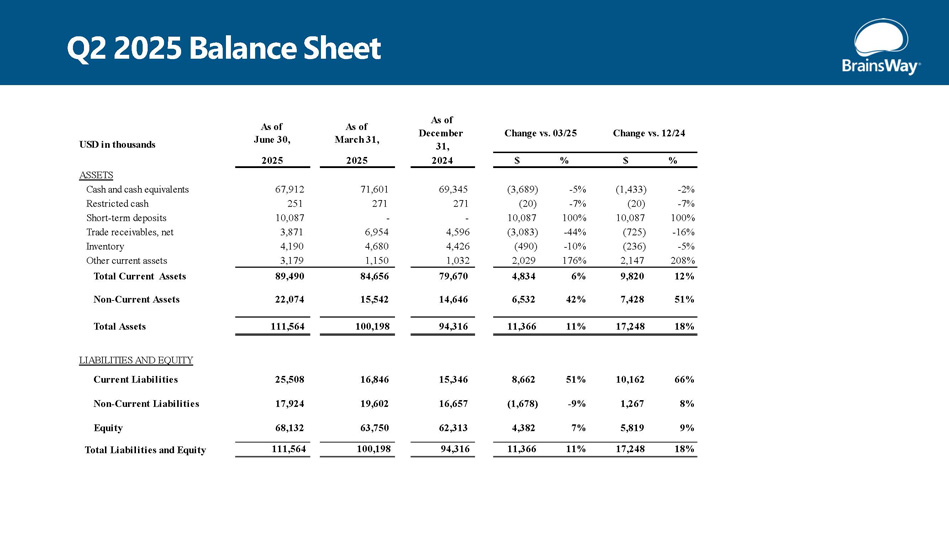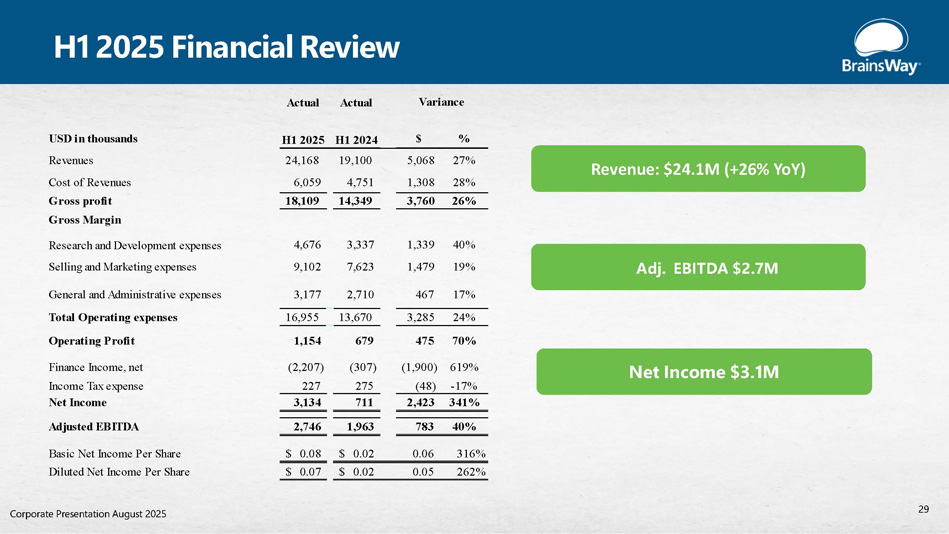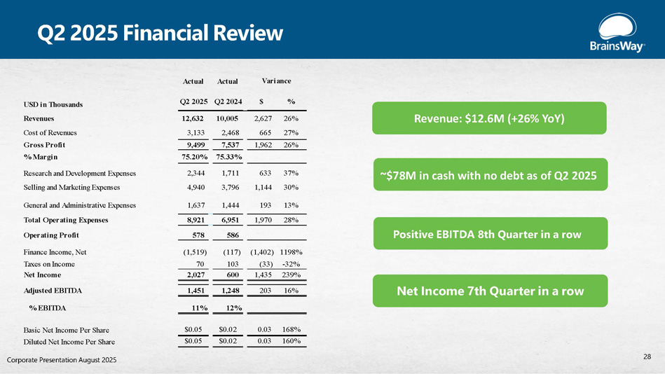 26 Corporate Presentation August 2025 Most Extensive and Broadest TMS Intellectual Property Encompassing Core Technology and Applications Key Portfolio Coverage Areas Deep TMS TM Coils Multi - Channel TMS Rotational Field Deep TMS Closed Loop TMS/EEG Patent Portfolio Issued Patents or Allowed Applications 30+ US 50+ OUS 27 Corporate Presentation August 2025 Q2 2025 Financial Review Positive EBITDA 8th Quarter in a row Net Income 7th Quarter in a row ~$78M in cash with no debt as of Q2 2025 Revenue: $12.6M (+26% YoY) Actual Actual Q2 2025 Q2 2024 $ % USD in Thousands Revenues 12,632 10,005 2,627 26% 27% 665 2,468 3,133 Cost of Revenues 26% 1,962 7,537 9,499 Gross Profit 75.33% 75.20% % Margin 37% 633 1,711 2,344 Research and Development Expenses 30% 1,144 3,796 4,940 Selling and Marketing Expenses 13% 193 1,444 1,637 General and Administrative Expenses 28% 1,970 6,951 8,921 Total Operating Expenses 586 578 Operating Profit 1198% (1,402) (117) (1,519) Finance Income, Net - 32% (33) 103 70 Taxes on Income 239% 1,435 600 2,027 Net Income 16% 203 1,248 1,451 Adjusted EBITDA % EBITDA 11% 12% 168% 0.03 $0.02 $0.05 Basic Net Income Per Share 160% 0.03 $0.02 $0.05 Diluted Net Income Per Share Variance 28 Corporate Presentation August 2025 H1 2025 Financial Review Adj.