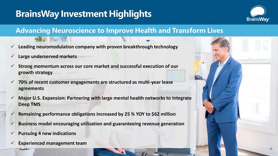BrainsWay Investment Highlights Advancing Neuroscience to Improve Health and Transform Lives x Leading neuromodulation company with proven breakthrough technology x Large underserved markets x Strong momentum across our core market and successful execution of our growth strategy x 70% of recent customer engagements are structured as multi - year lease agreements x Major U.S.