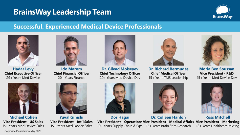 Expansion: Partnering with large mental health networks to integrate Deep TMS x Remaining performance obligations increased by 25 % YOY to $62 million x Business model encouraging utilization and guaranteeing revenue generation x Pursuing 4 new indications x Experienced management team 31 BrainsWay Leadership Team Successful, Experienced Medical Device Professionals Ido Marom Chief Financial Officer 20+ Years Finance Hadar Levy Chief Executive Officer 25 + Years Med Device Moria Ben Soussan Vice President - R&D 15+ Years Med Device Dev Yuval Gimshi Vice President – Int’l Sales 15+ Years Med Device Sales Dr. Richard Bermudes Chief Medical Officer 15+ Years TMS Leadership Dr. Gilead Moiseyev Chief Technology Officer 20+ Years Med Device Dev Dor Hagai Dr. Colleen Hanlon Ross Mitchell Vice President – Operations Vice President - Medical Affairs Vice President - Marketing 10+ Years Supply Chain & Ops 15+ Years Brain Stim Research 12+ Years Healthcare Mkting Michael Cohen Vice President - US Sales 15+ Years Med Device Sales Corporate Presentation May 2025 Thank you! 33 Investor Contact: Ido Marom Chief Financial Officer Ido.Marom@BrainsWay.com