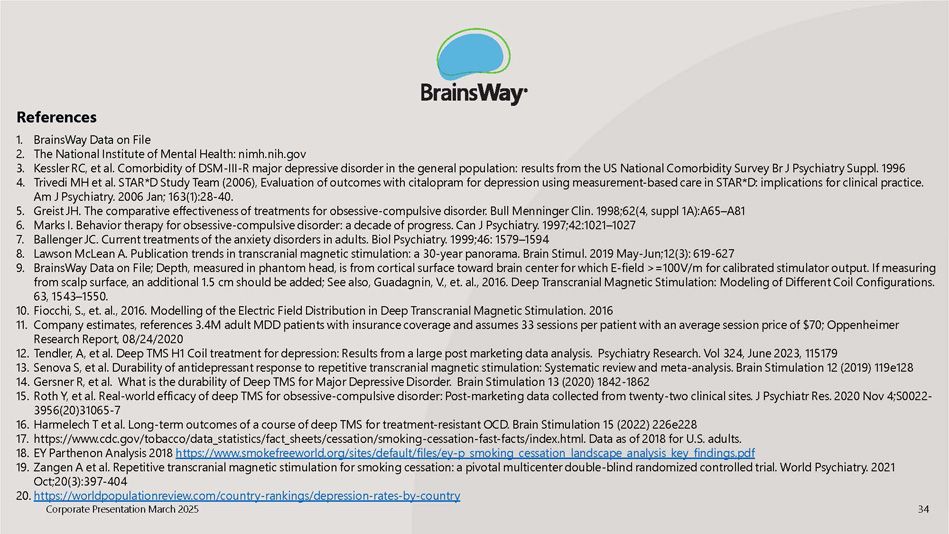 References 1. BrainsWay Data on File 2. The National Institute of Mental Health: nimh.nih.gov 3. Kessler RC, et al. Comorbidity of DSM - III - R major depressive disorder in the general population: results from the US National Comorbidity Survey Br J Psychiatry Suppl. 1996 4. Trivedi MH et al. STAR*D Study Team (2006), Evaluation of outcomes with citalopram for depression using measurement - based care in STAR*D: implications for clinical practice. Am J Psychiatry. 2006 Jan; 163(1):28 - 40. 5. Greist JH. The comparative effectiveness of treatments for obsessive - compulsive disorder. Bull Menninger Clin. 1998;62(4, suppl 1A):A65 – A81 6. Marks I. Behavior therapy for obsessive - compulsive disorder: a decade of progress. Can J Psychiatry. 1997;42:1021 – 1027 7. Ballenger JC. Current treatments of the anxiety disorders in adults. Biol Psychiatry. 1999;46: 1579 – 1594 8. Lawson McLean A. Publication trends in transcranial magnetic stimulation: a 30 - year panorama. Brain Stimul. 2019 May - Jun;12(3): 619 - 627 9. BrainsWay Data on File ; Depth, measured in phantom head, is from cortical surface toward brain center for which E - field >= 100 V/m for calibrated stimulator output . If measuring from scalp surface, an additional 1 . 5 cm should be added ; See also, Guadagnin, V . , et . al . , 2016 . Deep Transcranial Magnetic Stimulation : Modeling of Different Coil Configurations . 63 , 1543 – 1550 . 10. Fiocchi, S . , et . al . , 2016 . Modelling of the Electric Field Distribution in Deep Transcranial Magnetic Stimulation . 2016 11. Company estimates, references 3.4M adult MDD patients with insurance coverage and assumes 33 sessions per patient with an average session price of $70; Oppenheimer Research Report, 08/24/2020 12. Tendler, A, et al. Deep TMS H1 Coil treatment for depression: Results from a large post marketing data analysis. Psychiatry Research. Vol 324, June 2023, 115179 13. Senova S, et al. Durability of antidepressant response to repetitive transcranial magnetic stimulation: Systematic review and meta - analysis. Brain Stimulation 12 (2019) 119e128 14. Gersner R, et al. What is the durability of Deep TMS for Major Depressive Disorder. Brain Stimulation 13 (2020) 1842 - 1862 15. Roth Y, et al. Real - world efficacy of deep TMS for obsessive - compulsive disorder: Post - marketing data collected from twenty - two clinical sites. J Psychiatr Res. 2020 Nov 4;S0022 - 3956(20)31065 - 7 16. Harmelech T et al. Long - term outcomes of a course of deep TMS for treatment - resistant OCD. Brain Stimulation 15 (2022) 226e228 17. h ttps://www.cdc.gov/tobacco/data_statistics/fact_sheets/cessation/smoking - cessation - fast - facts/index.html. Data as of 2018 for U.S. adults. 18. EY Parthenon Analysis 2018 h ttps://www.smokefreeworld.org/sites/default/files/ey - p_smoking_cessation_landscape_analysis_key_findings.pdf 19. Zangen A et al. Repetitive transcranial magnetic stimulation for smoking cessation: a pivotal multicenter double - blind randomized controlled trial. World Psychiatry. 2021 Oct;20(3):397 - 404 20. https://worldpopulationreview.com/country - rankings/depression - rates - by - country Corporate Presentation March 2025 34