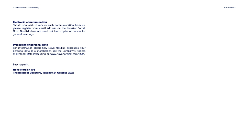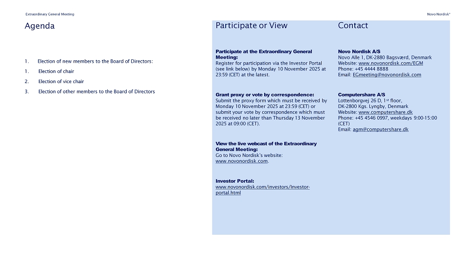 Novo Nordisk ® Extraordinary General Meeting Agenda 1. Election of new members to the Board of Directors: 1. Election of chair 2. Election of vice chair 3. Election of other members to the Board of Directors Participate or View Participate at the Extraordinary General Meeting: Register for participation via the Investor Portal (see link below) by Monday 10 November 2025 at 23:59 (CET) at the latest. Grant proxy or vote by correspondence: Submit the proxy form which must be received by Monday 10 November 2025 at 23:59 (CET) or submit your vote by correspondence which must be received no later than Thursday 13 November 2025 at 09:00 (CET). View the live webcast of the Extraordinary General Meeting: Go to Novo Nordisk’s website: www.novonordisk.com . Investor Portal: www.novonordisk.com/investors/Investor - portal.htm l Contact Novo Nordisk A/S Novo Alle 1, DK - 2880 Bagsværd, Denmark Website: www.novonordisk.com/EGM Phone: +45 4444 8888 Email: EGmeeting@novonordisk.com Computershare A/S Lottenborgvej 26 D, 1 st floor, DK - 2800 Kgs.