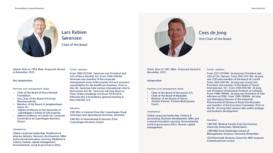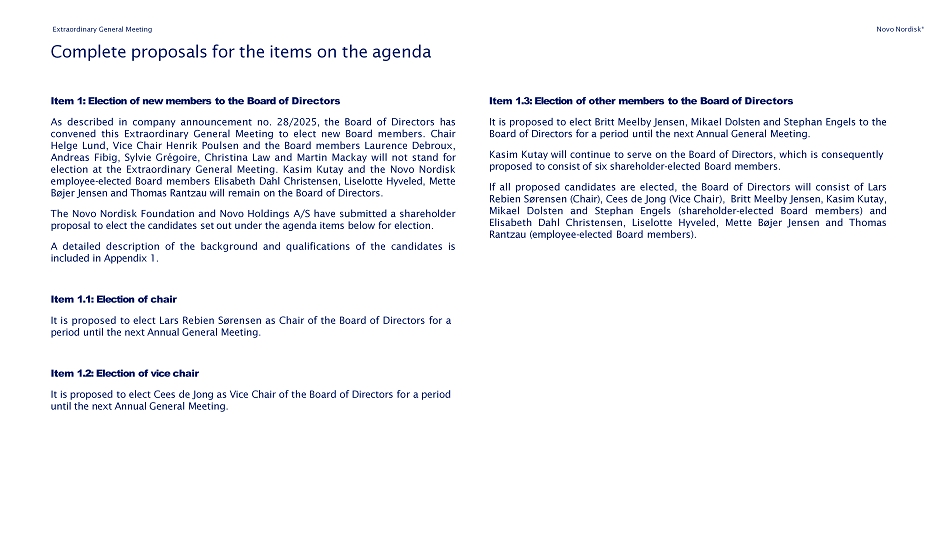 Lyngby, Denmark Website: www.computershare.dk Phone: +45 4546 0997, weekdays 9:00 - 15:00 (CET) Email: agm@computershare.dk Novo Nordisk ® Extraordinary General Meeting Complete proposals for the items on the agenda Item 1 : Election of new members to the Board of Directors As described in company announcement no . 28 / 2025 , the Board of Directors has convened this Extraordinary General Meeting to elect new Board members . Chair Helge Lund, Vice Chair Henrik Poulsen and the Board members Laurence Debroux, Andreas Fibig, Sylvie Grégoire, Christina Law and Martin Mackay will not stand for election at the Extraordinary General Meeting . Kasim Kutay and the Novo Nordisk employee - elected Board members Elisabeth Dahl Christensen, Liselotte Hyveled, Mette Bøjer Jensen and Thomas Rantzau will remain on the Board of Directors . The Novo Nordisk Foundation and Novo Holdings A/S have submitted a shareholder proposal to elect the candidates set out under the agenda items below for election . A detailed description of the background and qualifications of the candidates is included in Appendix 1 . Item 1.1: Election of chair It is proposed to elect Lars Rebien Sørensen as Chair of the Board of Directors for a period until the next Annual General Meeting. Item 1.2: Election of vice chair It is proposed to elect Cees de Jong as Vice Chair of the Board of Directors for a period until the next Annual General Meeting. Item 1 . 3 : Election of other members to the Board of Directors It is proposed to elect Britt Meelby Jensen, Mikael Dolsten and Stephan Engels to the Board of Directors for a period until the next Annual General Meeting . Kasim Kutay will continue to serve on the Board of Directors, which is consequently proposed to consist of six shareholder - elected Board members . If all proposed candidates are elected, the Board of Directors will consist of Lars Rebien Sørensen (Chair), Cees de Jong (Vice Chair), Britt Meelby Jensen, Kasim Kutay, Mikael Dolsten and Stephan Engels (shareholder - elected Board members) and Elisabeth Dahl Christensen, Liselotte Hyveled, Mette Bøjer Jensen and Thomas Rantzau (employee - elected Board members) .
