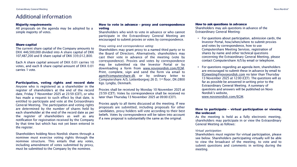 Novo Nordisk ® Extraordinary General Meeting Additional information Majority requirements All proposals on the agenda may be adopted by a simple majority of votes. Share capital The current share capital of the Company amounts to DKK 446 , 500 , 000 divided into A share capital of DKK 107 , 487 , 200 and B share capital of DKK 339 , 012 , 800 . Each A share capital amount of DKK 0 . 01 carries 10 votes, and each B share capital amount of DKK 0 . 01 carries 1 vote . Participation, voting rights and record date Anyone who is registered as a shareholder in the register of shareholders at the end of the record date, Friday 7 November 2025 at 23 : 59 (CET), or who has made a request to such effect by that date, is entitled to participate and vote at the Extraordinary General Meeting . The participation and voting rights are determined by the number of shares held by each shareholder at the end of the record date as per the register of shareholders as well as any notification for registration received by the Company by that time but which has not yet been entered in the register . Shareholders holding Novo Nordisk shares through a nominee must exercise voting rights through the nominee structure . This entails that any votes, including amendment of votes submitted by proxy, must be submitted to the Company by the nominee . How to vote in advance – proxy and correspondence voting Shareholders who wish to vote in advance or who cannot participate in the Extraordinary General Meeting are encouraged to submit proxies or votes by correspondence . Proxy voting and correspondence voting : Shareholders may grant proxy to a named third party or to the Board of Directors . Alternatively, shareholders may cast their vote in advance of the meeting (vote by correspondence) . Proxies and votes by correspondence may be submitted via the Investor Portal or by downloading a form from www . novonordisk . com/EGM . Print, complete, sign and send the form via email to agm@computershare . dk or by ordinary letter to Computershare A/S, Lottenborgvej 26 D, 1 st floor, DK - 2800 Kgs . Lyngby, Denmark . Proxies shall be received by Monday 10 November 2025 at 23 : 59 (CET) . Votes by correspondence shall be received no later than Thursday 13 November 2025 at 09 : 00 (CET) . Proxies apply to all items discussed at the meeting . If new proposals are submitted, including proposals for other candidates, proxy holders will vote according to their best beliefs . Votes by correspondence will be taken into account if a new proposal is substantially the same as the original . How to ask questions in advance Shareholders may ask questions in advance of the Extraordinary General Meeting: • For questions about participation, admission cards, the Investor Portal, how/when/where to submit proxies and votes by correspondence, how to use Computershare Meeting Services, registration of shares by name and other technical questions concerning the Extraordinary General Meeting, please contact Computershare A/S by email or telephone. • For questions regarding an agenda item, shareholders are encouraged to submit these in advance by email to EGmeeting@novonordisk.com no later than Thursday 13 November 2025 at 12:00 (CET). The questions will as far as possible be answered in writing prior to the Extraordinary General Meeting. A summary of questions and answers will be published on Novo Nordisk’s website, www.novonordisk.com/EGM . How to participate – virtual participation or viewing the webcast As the meeting is held as a fully electronic meeting, shareholders may participate in or view the Extraordinary General Meeting as follows : Virtual participation : Shareholders must register for virtual participation, please see below . Shareholders participating virtually will be able to view the broadcast of the meeting, to vote and to submit questions and comments in writing during the meeting .