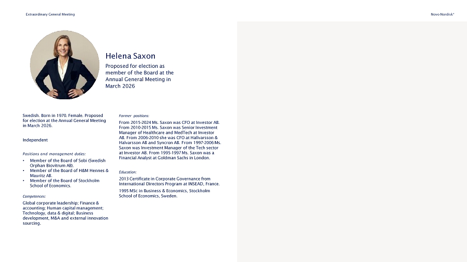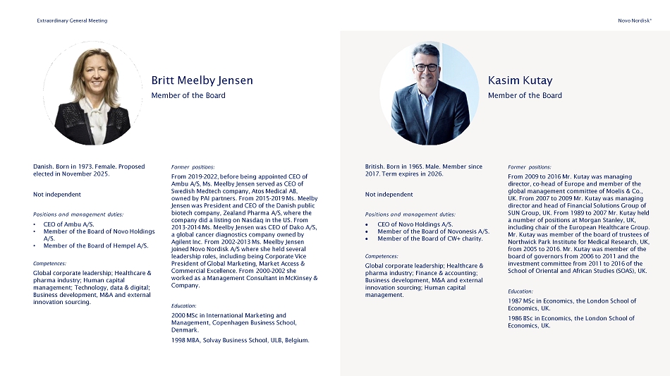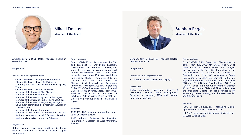 Best regards, Novo Nordisk A/S The Board of Directors, Tuesday 21 October 2025 Novo Nordisk ® Appendix 1 – Shareholder proposal for candidates for the Board of Directors The Novo Nordisk Foundation and Novo Holdings A/S have submitted a shareholder proposal to elect the candidates set out herein . This Appendix has been received from the Novo Nordisk Foundation and Novo Holdings A/S . The Board Competency Profile In accordance with the Company’s Board Competency Profile which is available on https://www.novonordisk.com/about/corporate - governance . html , all Board members should possess integrity, accountability, fairness, financial literacy, commitment, desire for innovation, a corporate social responsible mindset and a collaborative mindset . Additionally, the collective competences of the shareholder - elected Board members should include experience within the competences listed in the Board Competency Profile as well as two additional competencies (Direct - to - consumer marketing, US pharmaceutical market expertise) which will be added to the Board Competency Profile following the Extraordinary General Meeting : • Global corporate leadership • Healthcare & pharma industry • Finance & accounting • Business development, M&A & external innovation sourcing • Human capital management • Medicine & science • Environmental, social & governance (ESG) • Technology, data & digital • Direct - to - consumer marketing • US pharmaceutical market expertise If all proposed candidates are elected to the Board, the Board will collectively possess the desired competences and experience . Diversity ambition The following aspirations have guided the identification of shareholder - elected candidates for the Board : • The Board should consist of at least two shareholder - elected Board members with Nordic nationality and at least two shareholder - elected Board members with a nationality other than Nordic . • By 2026 , the Board should consist of at least three shareholder - elected Board members who are women and three who are men . With the proposed candidates, the shareholder - elected Board members will consist of three Nordic members and three non - Nordic members. Of these, one member is female and five are male. Further to these, Ms. Helena Saxon has been identified as a candidate to be proposed for election to the Board at the Annual General Meeting in March 2026. It is therefore the intention to identify one additional candidate with complementary competences to be elected at the Annual General Meeting in March 2026, at which point the aim is to fulfil both the nationality and gender ambitions. Independence It is an aspiration that at least half of the Company’s shareholder - elected Board members should be independent in accordance with the Danish Corporate Governance Recommendations. Three of the proposed candidates, Mr . Sørensen, Mr . Kutay and Ms . Meelby Jensen, are not considered to be independent . Mr . Sørensen holds the Chair position at the Board of the Novo Nordisk Foundation, the ultimate controlling shareholder of the Company . Ms . Meelby Jensen holds a board position at Novo Holdings A/S, while Mr . Kutay is Chief Executive Officer of Novo Holdings A/S, the Novo Nordisk Foundation’s investment company and the main shareholder of Novo Nordisk A/S . If all proposed candidates are elected to the Board, the Board will satisfy the aspiration to have a number of Board members representing the main shareholder and that at least half of the Board members elected by the shareholders shall be independent. Mr. Kutay is not up for election as his term runs until the Annual General Meeting in March 2026. He continues on the Board through his term. After the Extraordinary General Meeting, the Board will elect its committee members and e.g. intends to elect members of the Audit Committee who qualify as independent as required and defined by the US Securities and Exchange Commission (SEC) as well as the Danish Act on Approved Auditors and Audit Firms. Mr. Engels qualifies for these requirements, and the same applies to Ms. Saxon upon election at the Annual General Meeting in March 2026. Extraordinary General Meeting Novo Nordisk ® Cees de Jong Vice Chair of the Board Dutch.