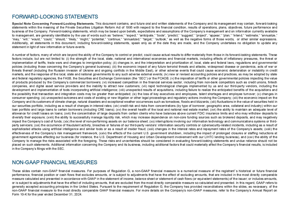 FORWARD - LOOKING STATEMENTS Special Note Concerning Forward - Looking Statements . This document contains, and future oral and written statements of the Company and its management may contain, forward - looking statements within the meaning of the Private Securities Litigation Reform Act of 1995 with respect to the financial condition, results of operations, plans, objectives, future performance and business of the Company . Forward - looking statements, which may be based upon beliefs, expectations and assumptions of the Company’s management and on information currently available to management, are generally identifiable by the use of words such as “believe,” “expect,” “anticipate,” “bode”, “predict,” “suggest,” “project”, “appear,” “plan,” “intend,” “estimate,” ”annualize,” “may,” “will,” “would,” “could,” “should,” “likely,” “might,” “potential,” “continue,” “annualized,” “target,” “outlook,” as well as the negative forms of those words, or other similar expressions . Additionally, all statements in this document, including forward - looking statements, speak only as of the date they are made, and the Company undertakes no obligation to update any statement in light of new information or future events . A number of factors, many of which are beyond the ability of the Company to control or predict, could cause actual results to differ materially from those in its forward - looking statements . These factors include, but are not limited to : (i) the strength of the local, state, national and international economies and financial markets, including effects of inflationary pressures, the threat or implementation of tariffs, trade wars and changes to immigration policy ; (ii) changes in, and the interpretation and prioritization of, local, state and federal laws, regulations and governmental policies (including those concerning the Company’s general business) ; (iii) the economic impact of any future terrorist threats and attacks, widespread disease or pandemics, acts of war or threats thereof (including the Russian invasion of Ukraine and ongoing conflicts in the Middle East), or other adverse events that could cause economic deterioration or instability in credit markets, and the response of the local, state and national governments to any such adverse external events ; (iv) new or revised accounting policies and practices, as may be adopted by state and federal regulatory agencies, the FASB, the Securities and Exchange Commission (the “SEC”) or the PCAOB ; (v) the imposition of tariffs or other governmental policies impacting the value of products produced by the Company’s commercial borrowers ; (vi) increased competition in the financial services sector, including from non - bank competitors such as credit unions, fintech companies, and digital asset service providers and the inability to attract new customers ; (vii) rapid technological changes implemented by us and our third - party vendors, including the development and implementation of tools incorporating artificial intelligence ; (viii) unexpected results of acquisitions, including failure to realize the anticipated benefits of the acquisitions and the possibility that transaction and integration costs may be greater than anticipated ; (ix) the loss of key executives and employees, talent shortages and employee turnover ; (x) changes in consumer spending ; (xi) unexpected outcomes and costs of existing or new litigation or other legal proceedings and regulatory actions involving the Company ; (xii) the economic impact on the Company and its customers of climate change, natural disasters and exceptional weather occurrences such as tornadoes, floods and blizzards ; (xiii) fluctuations in the value of securities held in our securities portfolio, including as a result of changes in interest rates ; (xiv) credit risk and risks from concentrations (by type of borrower, geographic area, collateral and industry) within our loan portfolio and large loans to certain borrowers (including CRE loans) ; (xv) the overall health of the local and national real estate market ; (xvi) the ability to maintain an adequate level of allowance for credit losses on loans ; (xvii) the concentration of large deposits from certain clients who have balances above current FDIC insurance limits and who may withdraw deposits to diversify their exposure ; (xviii) the ability to successfully manage liquidity risk, which may increase dependence on non - core funding sources such as brokered deposits, and may negatively impact the Company’s cost of funds ; (xix) the level of non - performing assets on our balance sheet ; (xx) interruptions involving our information technology and communications systems or third - party servicers ; (xxi) the occurrence of fraudulent activity, breaches or failures of our third - party vendors’ information security controls or cybersecurity - related incidents, including as a result of sophisticated attacks using artificial intelligence and similar tools or as a result of insider fraud ; (xxii) changes in the interest rates and repayment rates of the Company’s assets ; (xxiii) the effectiveness of the Company’s risk management framework, (xxiv) the ef fects of the current U . S . government shutdown, including the impact of prolonged closures or staffing reductions at government agencies ef fecting our business (for instance, the U . S . Department of Housing and Urban Development involvement with our LIHTC lending business), and (xxv) the ability of the Company to manage the risks associated with the foregoing . These risks and uncertainties should be considered in evaluating forward - looking statements and undue reliance should not be placed on such statements . Additional information concerning the Company and its business, including additional factors that could materially affect the Company’s financial results, is 