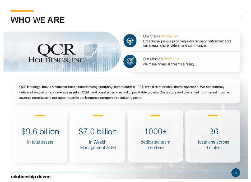 Our Vision Guides Us. Exceptional people providing extraordinary performance for our clients, shareholders, and communities. Our Mission Drives Us. We make financial dreams a reality. QCR Holdings, Inc. is a Midwest - based bank holding company, established in 1993, with a relationship - driven approach. We consistently deliver strong returns on average assets (ROAA) and boast a track record of profitable growth. Our unique and diversified noninterest income sources contribute to our upper quartile performance compared to industry peers. $9.6 billion in total assets $7.0 billion in Wealth Management AUM 1000+ dedicated team members 36 locations across 3 states.