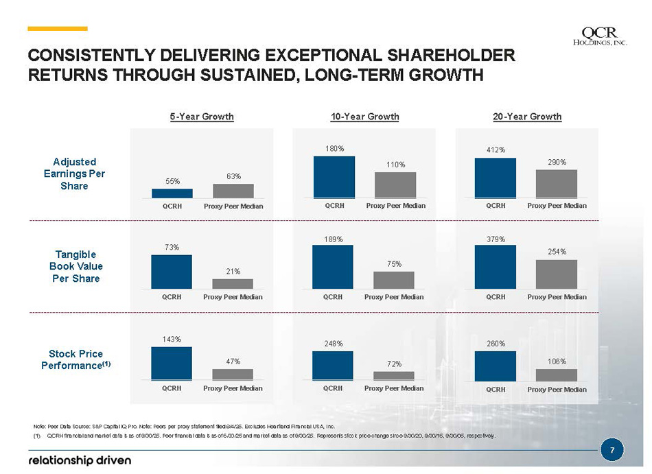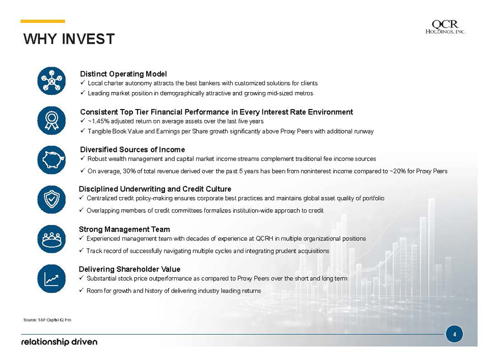 WHO WE ARE 3 WHY INVEST Distinct Operating Model x Local charter autonomy attracts the best bankers with customized solutions for clients x Leading market position in demographically attractive and growing mid - sized metros Consistent Top Tier Financial Performance in Every Interest Rate Environment x ~1.45% adjusted return on average assets over the last five years x Tangible Book Value and Earnings per Share growth significantly above Proxy Peers with additional runway Diversified Sources of Income x Robust wealth management and capital market income streams complement traditional fee income sources x On average, 30% of total revenue derived over the past 5 years has been from noninterest income compared to ~20% for Proxy Peers Disciplined Underwriting and Credit Culture x Centralized credit policy - making ensures corporate best practices and maintains global asset quality of portfolio x Overlapping members of credit committees formalizes institution - wide approach to credit Strong Management Team x Experienced management team with decades of experience at QCRH in multiple organizational positions x Track record of successfully navigating multiple cycles and integrating prudent acquisitions Delivering Shareholder Value x Substantial stock price outperformance as compared to Proxy Peers over the short and long term x Room for growth and history of delivering industry leading returns Source: S&P Capital IQ Pro 4 Market Share (2) Deposits (2) # Locations States/Region Entity #1 $2.3B 5 Iowa/Illinois - Quad Cities Quad City Bank & Trust #1 $1.9B 8 Iowa - Cedar Rapids/Cedar Valley Cedar Rapids Bank & Trust 1 #2 $1.9B 14 Missouri - Springfield Guaranty Bank #7 $1.3B 9 Iowa - Des Moines/ Ankeny Community State Bank • Municipal & low - income housing tax credit (“LIHTC”) lending • Generates capital markets revenue from interest rate swap fees and gains on loan securitizations related to LIHTC lending Wealth Management • Broad scope of services with recent expansion in southwest Missouri and central Iowa • $7.0 billion in AUM as of 9/30/25 Correspondent Banking • Competitive deposit products • 189 banking relationships • Approximately $1.3 billion in liquidity Four distinct operating bank charters, managed by local veteran bankers, governed by local Boards of Directors with customize d solutions by market DIFFERENTIATED BUSINESS LINES Specialty Finance Group (“SFG”) TRADITIONAL BANKING (1) Cedar Rapids Bank & Trust includes Community Bank & Trust in the Cedar Valley.