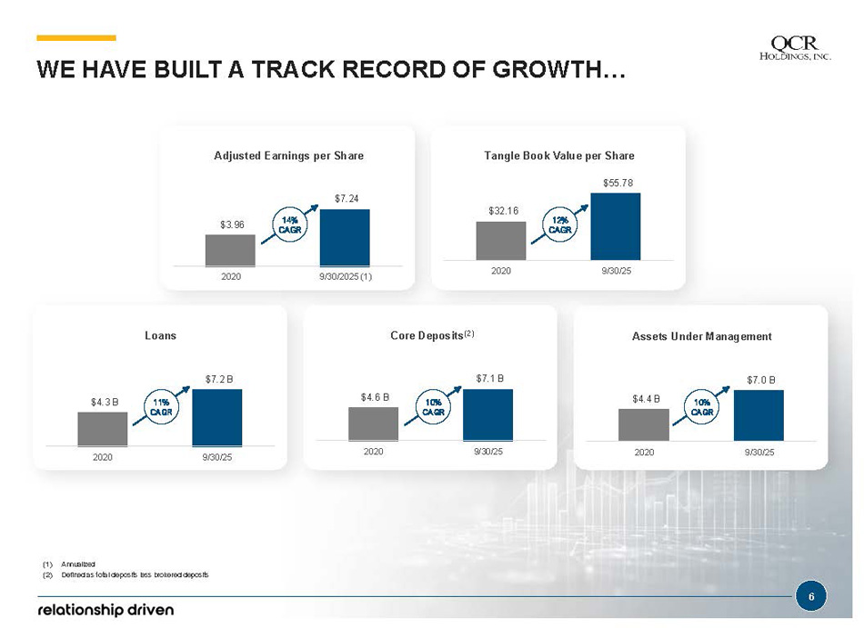 (2) Location, deposit data, and market share as of 6/30/25 DIFFERENTIATED BUSINESS LINES DRIVE OUTSTANDING RESULTS 36% of our revenue was derived from noninterest income, totaling $37 million in Q3 2025 5 WE HAVE BUILT A TRACK RECORD OF GROWTH… (1) Annualized (2) Defined as total deposits less brokered deposits Adjusted Earnings per Share $3.96 $7.24 2020 9/30/2025 (1) 14% CAGR $32.16 $55.78 2020 9/30/25 Tangle Book Value per Share $4.4 B $7.0 B 2020 9/30/25 Assets Under Management Loans $4.3 B $7.2 B 2020 9/30/25 $4.6 B $7.1 B 2020 9/30/25 Core Deposits (2) 12% CAGR 11% CAGR 10% CAGR 10% CAGR 6
