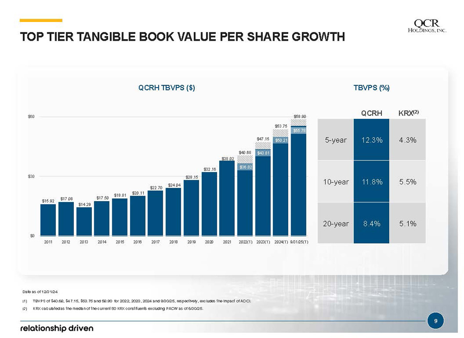 8 KRX (2) QCRH QCRH TBVPS ($) TBVPS (%) $15 .92 $17 .08 $14 .29 $17 .50 $18 .81 $20 .11 $22 .70 $24 .04 $28 .15 $32 .16 $38 .02 $36 .82 $43 .81 $50 .21 $40 .68 9 $47 .15 $53 .75 $55 .78 $58 .90 $0 $30 $60 2011 2012 2013 2014 2015 2016 2017 2018 2019 2020 2021 2022(1) 2023(1) 2024(1) 9/31/25(1) 4.3% 12.3% 5 - year 5.5% 11.8% 10 - year 5.1% 8.4% 20 - year KRX (2) TOP TIER TANGIBLE BOOK VALUE PER SHARE GROWTH QCRH Date as of 12/31/24 (1) TBVPS of $40.68, $4 7.15, $53.75 and 58.90 for 202 2, 2023 , 2024 and 9/30/25, respectively, excludes the impact of AOCI. (2) KRX calculated as the median of the current 50 KRX constituents excluding PACW as of 6/30/25.